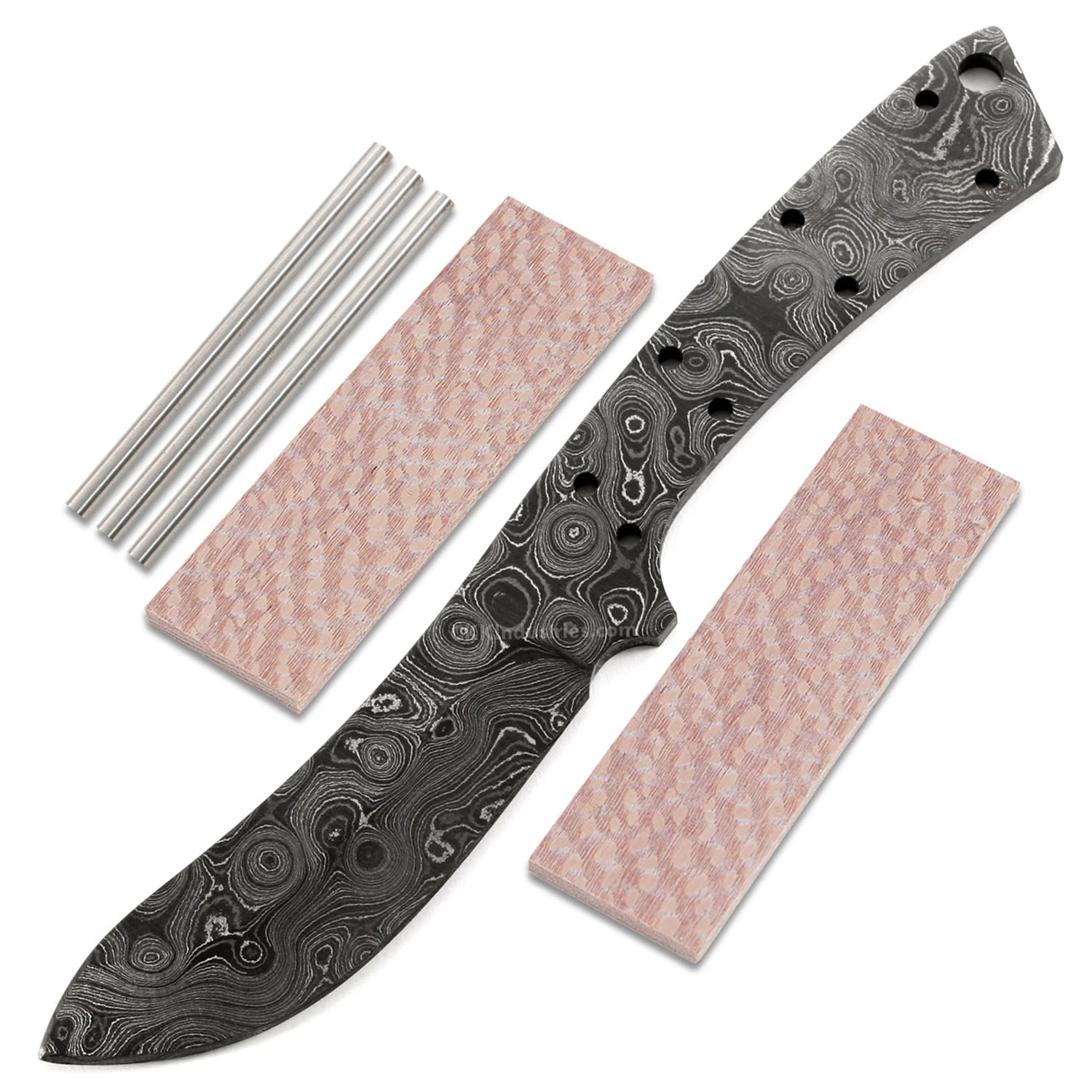 This damascus skinning knife design is called the “River Skinner”. It is a USA Made carbon steel damascus fixed blade that is hollow-ground and ready to build. This model will make a fantastic skinning/hunting knife design. The River Skinner would also make a great pick as a collectible gift project. With a blade length of 3.00 inches and an overall length of 7.56 inches, this design is a perfect sheath size. Ground on both sides, the River Skinner’s blade is 1.00 inches wide with a 0.150 inch thickness. This damascus skinner blade blank design features (8) 0.125 inch through holes for handle construction (stainless steel pinstock included), and (1) 0.250 inch thong hole for optional use. These holes can be easily modified to work with larger pinstock or threaded fasteners.