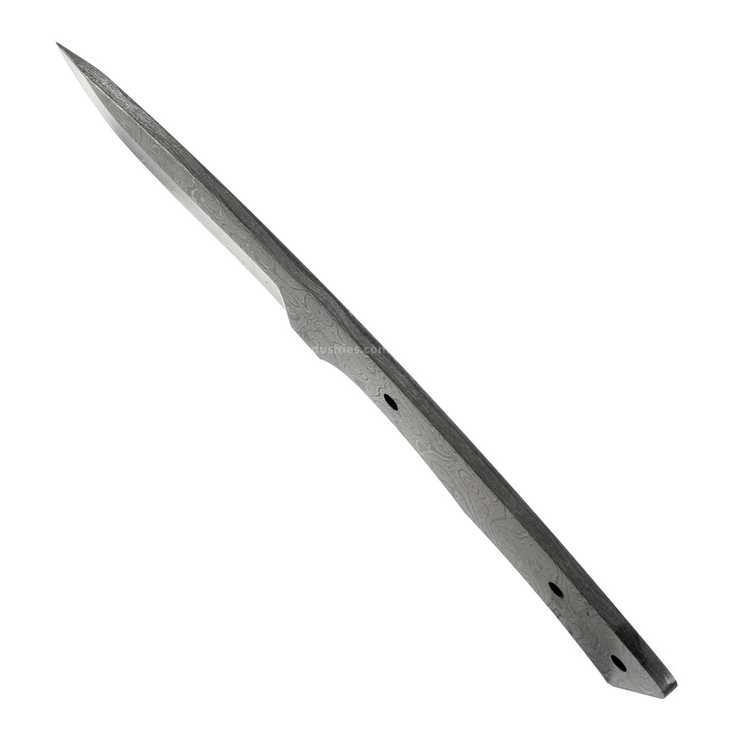 This classic damascus spear point knife kit design is called the “Rover”. It is a USA Made carbon steel damascus fixed blade knife blank that is hollow-ground and ready to build. This spear point blade blank model will make a fantastic hunting knife, or will serve very well as a collectible gift project. With a blade length of 3.50 inches and an overall length of 8.125 inches, this design is a perfect carry size. Ground on both sides, the Rover’s blade is .850 inches wide with a .160 inch thickness. This damascus hunting knife design features (3) .156 inch through-holes for handle construction (stainless steel pinstock included). This model’s tang holes can be modified with ease to work with larger pinstock, or with threaded fasteners. Please see our knife handle attachment parts and tools sections for more options.
