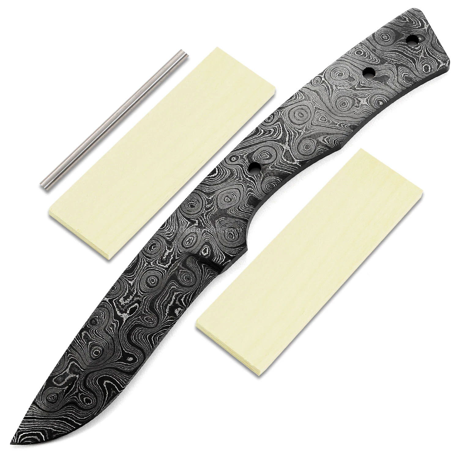 This classic damascus spear point knife kit design is called the “Rover”. It is a USA Made carbon steel damascus fixed blade knife blank that is hollow-ground and ready to build. This spear point blade blank model will make a fantastic hunting knife, or will serve very well as a collectible gift project. With a blade length of 3.50 inches and an overall length of 8.125 inches, this design is a perfect carry size. Ground on both sides, the Rover’s blade is .850 inches wide with a .160 inch thickness. This damascus hunting knife design features (3) .156 inch through-holes for handle construction (stainless steel pinstock included). This model’s tang holes can be modified with ease to work with larger pinstock, or with threaded fasteners. Please see our knife handle attachment parts and tools sections for more options.