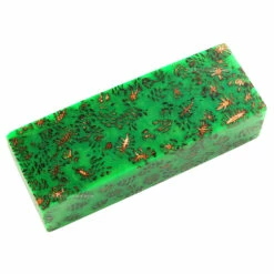 This is the latest knife handle material, called a “Sapphire Mini-Cone”. These Mini-Cone knife handle blocks are highly unique, as they feature a miniature pine cone embedded in deluxe metallic resin. Each suspended cone is beautifully arranged and exceptionally individual. If you’re looking for the perfect knife handle material for your next exotic creation, try a sapphire cone. This resin knife handle material features plenty of contrast and will polish to an amazing finish. This Sapphire Mini Cone knife handle block size is perfect for custom knife or gun grips. You can easily yield two or more full-sized knife handle scale sets from this block.