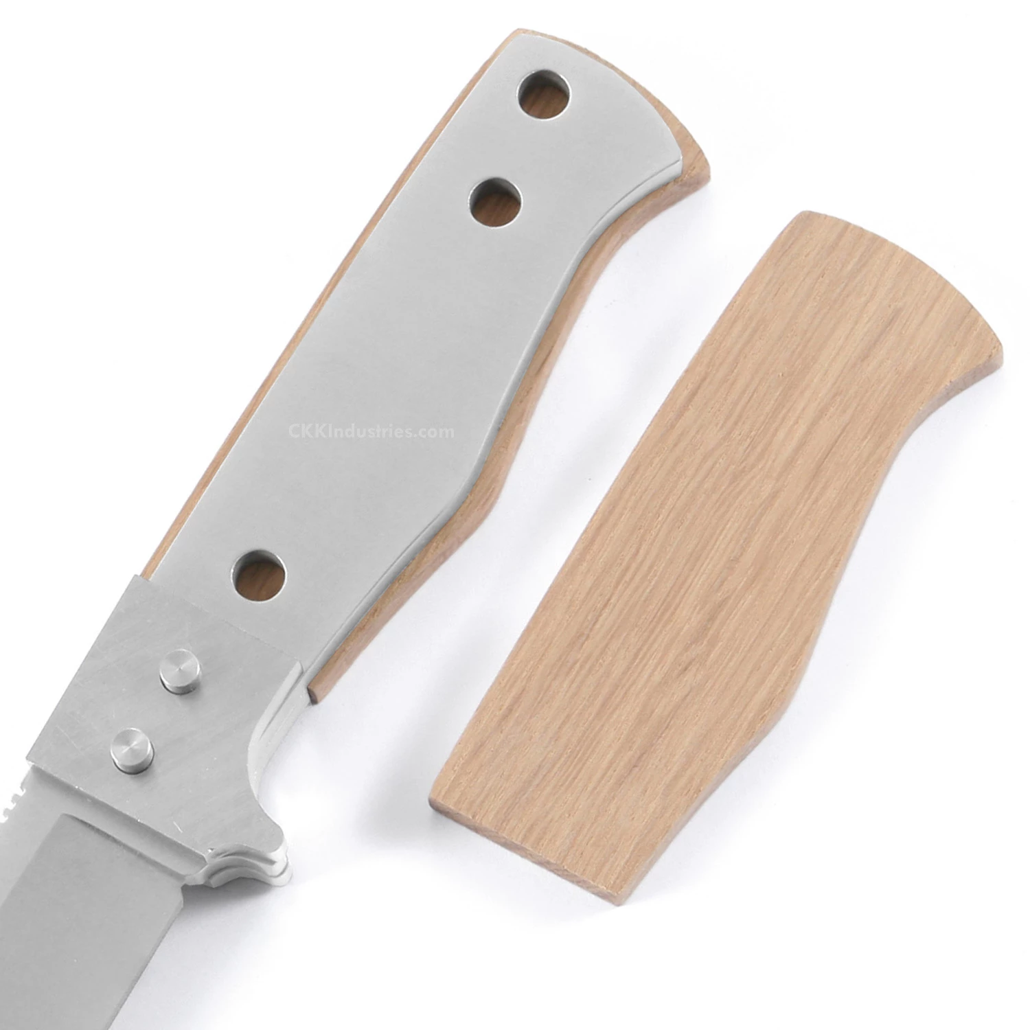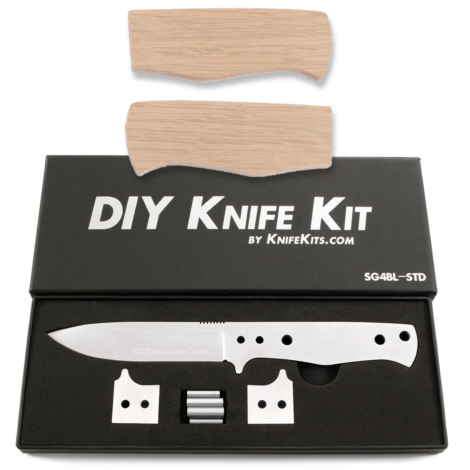 The grind lines on this fixed blade knife blank are very sharp and extremely crisp. With a 600 grit satin finish on the blade, the SG4 makes a great starting point for a superior quality finished piece. This version is the combo kit. It comes with all of the basic SG4 kit parts, plus pre-machined Red Oak handle scales to simplify the completion process. Add a touch of proper finishing and create a fabulous knife that you’ll be proud to own and carry.
