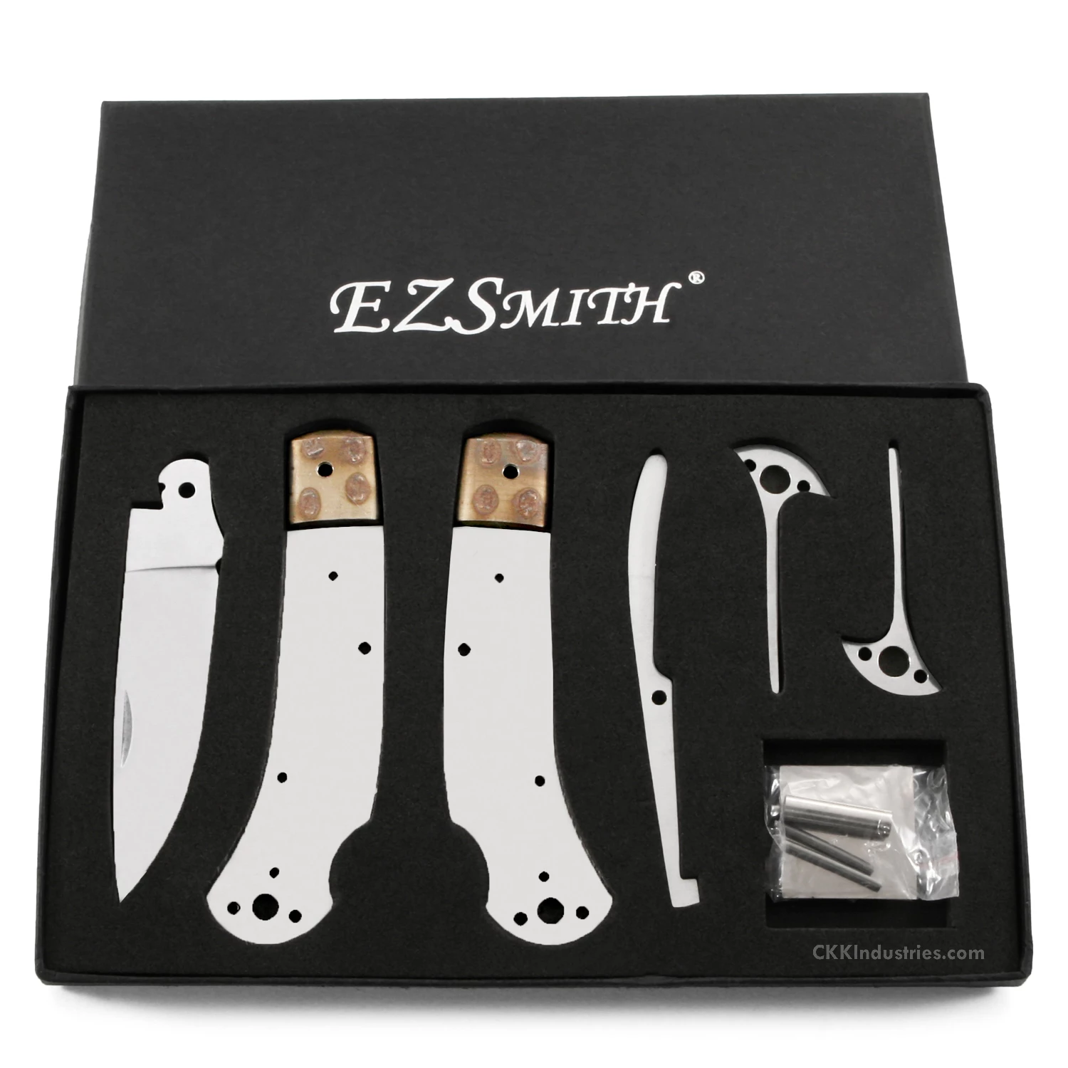 The USA-designed Sheriff Lockback folding knife kit has a 2.625 inch satin finished flat-ground blade made from 440C stainless steel. The blade on this model has been heat-treated and cryogenically processed for additional toughness and edge holding performance. The bolsters, pins, tubing, and liners on the Sheriff Lockback are made from durable 420 stainless steel. This folding lockback design is 4.00 inches when closed, and is 7.00 inches when fully opened. This version is the Sheriff Lockback naked parts kit. It comes with all the necessary knife assembly parts, including stainless steel blade, liners, pins, back springs, thong hole tubing, but does not include handle scales. This is a popular option for makers who already have their own handle materials. As this model is a premium designed KnifeKits original, it comes with its own stylized gift box. Add a touch of proper finishing and you can create a fabulous lockback custom folding knife that you’ll be proud to own and carry for a lifetime.