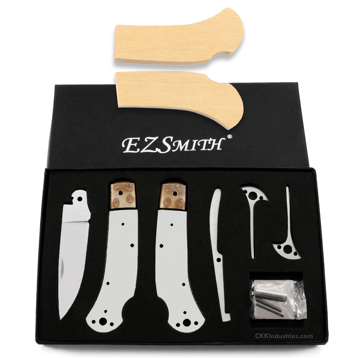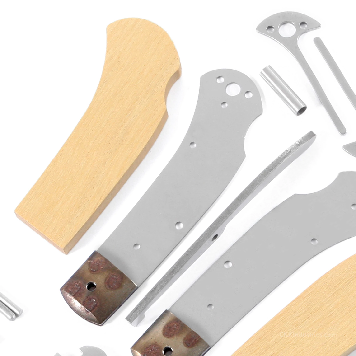 The USA-designed Sheriff Lockback folding knife kit has a 2.625 inch satin finished flat-ground blade made from 440C stainless steel. The blade on this model has been heat-treated and cryogenically processed for additional toughness and edge holding performance. The bolsters, pins, tubing, and liners on the Sheriff Lockback are made from durable 420 stainless steel. This folding lockback design is 4.00 inches when closed, and is 7.00 inches when fully opened. This version is the Sheriff Lockback combo kit. It comes with all the necessary knife assembly parts, including stainless steel blade, liners, pins, back springs, thong hole tubing, and includes a pre-machined set of Yellowheart wood handle scales to simplify the buildout process. And, as this model is a premium designed KnifeKits original, it comes with its own stylized gift box. Add a touch of proper finishing and you can create a fabulous lockback custom folding knife that you’ll be proud to own and carry for a lifetime.