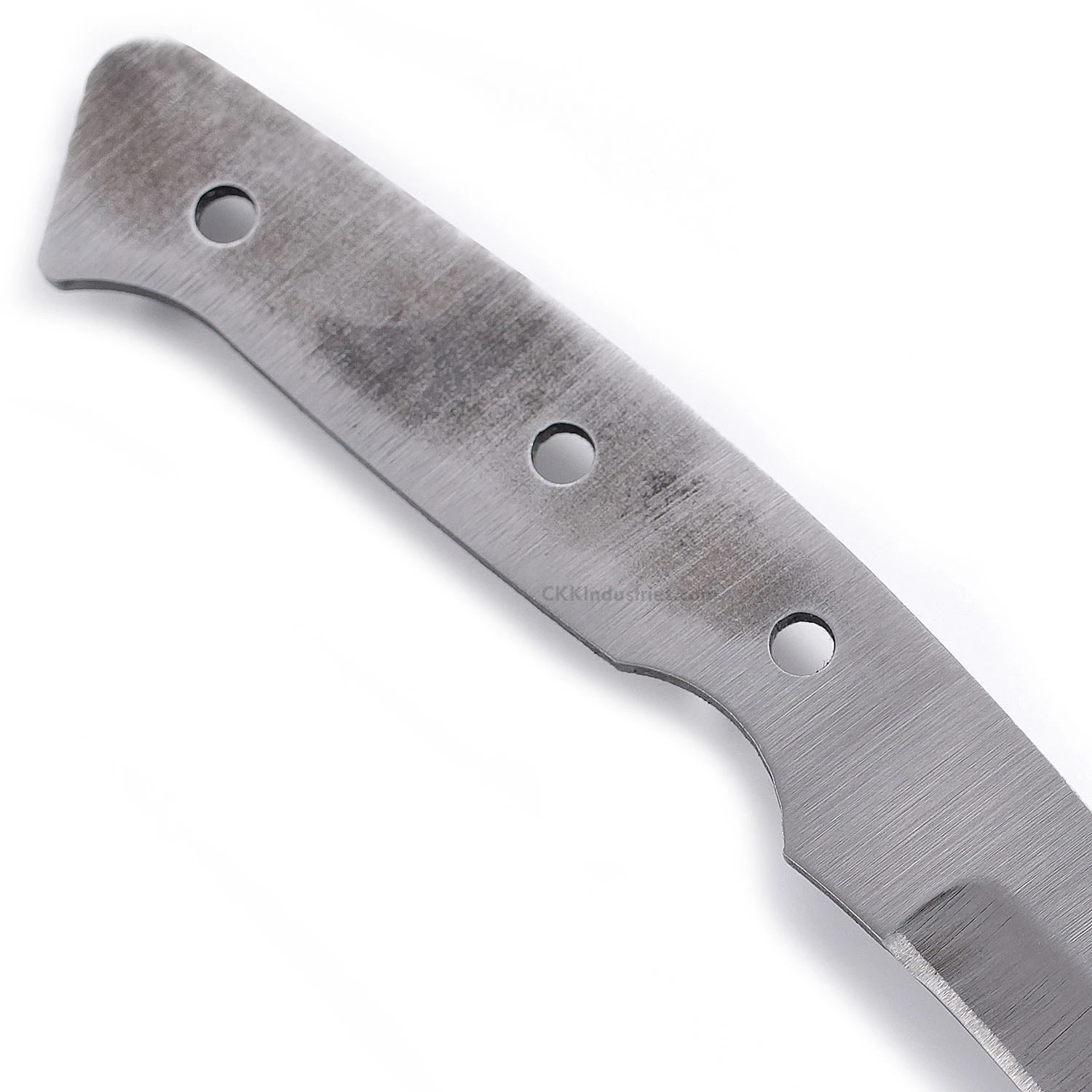 This carry-sized high carbon blade blank design is called the “Side Spur”. It is a USA Made carbon steel high carbon fixed blade knife blank that is hollow-ground and ready to build. This high carbon utility knife making kit makes a fantastic personal carry knife. The Side Spur knife kit has a blade length of 3.50 inches and an overall length of 8.125 inches. Ground on both sides, the blade is 7/8 inches wide. This high carbon blade blank features (3) .250 inch through-holes for handle construction (stainless steel pinstock included). The tang holes can be modified with ease to work with larger pinstock, or with threaded fasteners. Please see our drills and taps sections for more options.