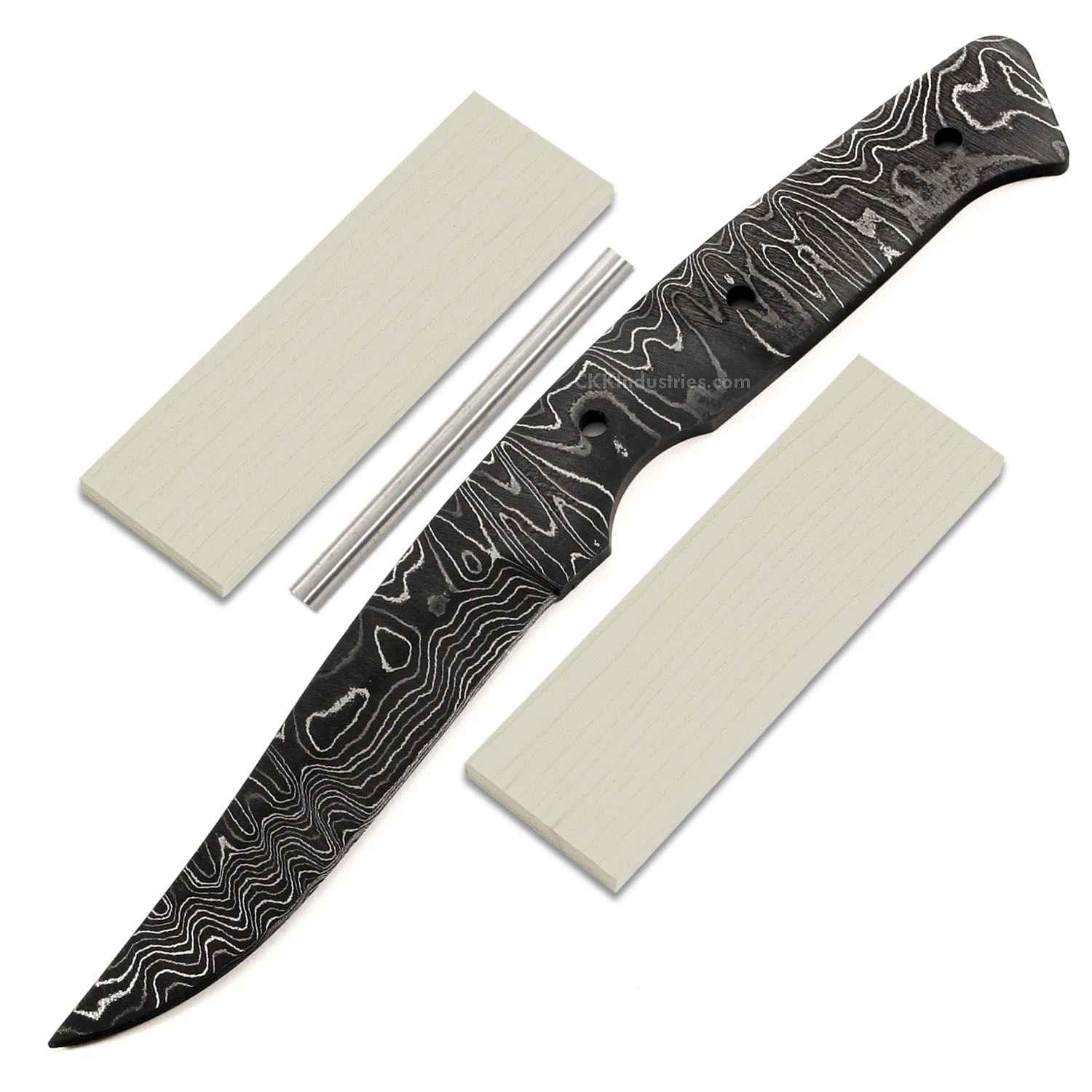 This carry-sized damascus blade blank design is called the “Side Spur”. It is a USA Made carbon steel damascus fixed blade knife blank that is hollow-ground and ready to build. This damascus utility knife making kit makes a fantastic personal carry knife. The Side Spur knife kit has a blade length of 3.50 inches and an overall length of 8.125 inches. Ground on both sides, the blade is 7/8″ wide. This damascus blade blank features (3) .250” through-holes for handle construction (stainless steel pinstock included). The tang holes can be modified with ease to work with larger pinstock, or with threaded fasteners. Please see our drills and taps sections for more options.