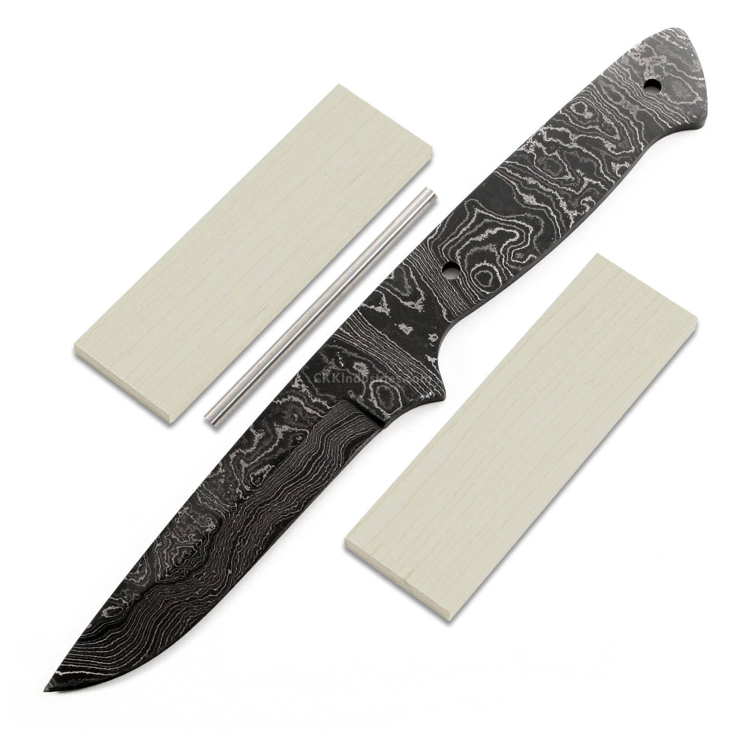 This damascus hunting knife making kit is called the “Sierra Hunter”. It is a USA Made carbon steel damascus fixed blade knife blank that is hollow-ground and ready to build. This damascus hunting blade blank model is the perfect project for weekend hobbiasts or serious knife builders. The design is a top-shelf personal hunting blade. The Sierra Hunter knife kit has a blade length of 3.875 inches and an overall length of 9.00 inches. Ground on both sides, the blade is 0.93 inches wide. This damascus blade blank design features (2) .187 inch through-holes for handle construction (stainless steel pinstock included). The tang holes can be modified with ease to work with larger pinstock, or with threaded fasteners.