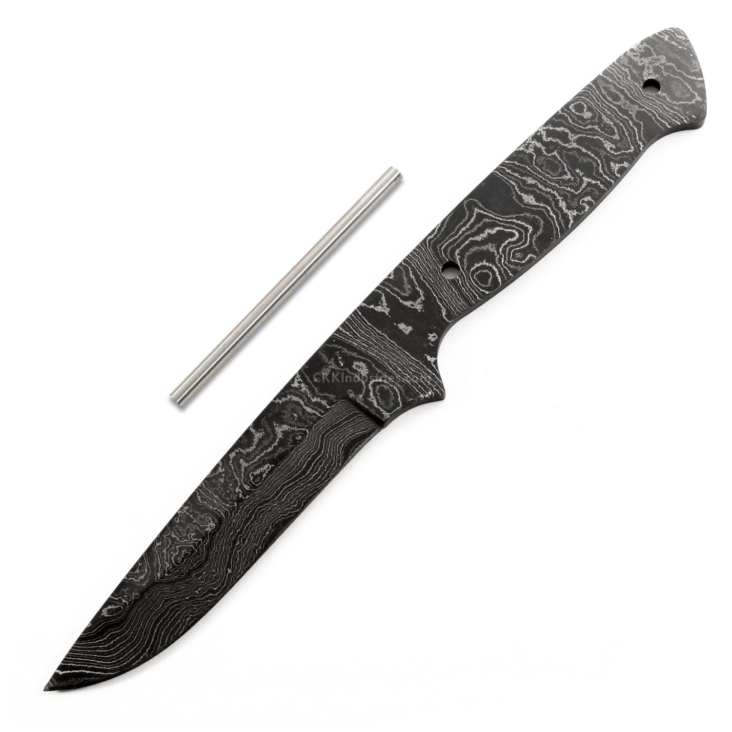 This damascus hunting knife making kit is called the “Sierra Hunter”. It is a USA Made carbon steel damascus fixed blade knife blank that is hollow-ground and ready to build. This damascus hunting blade blank model is the perfect project for weekend hobbiasts or serious knife builders. The design is a top-shelf personal hunting blade. The Sierra Hunter knife kit has a blade length of 3.875 inches and an overall length of 9.00 inches. Ground on both sides, the blade is 0.93 inches wide. This damascus blade blank design features (2) .187 inch through-holes for handle construction (stainless steel pinstock included). The tang holes can be modified with ease to work with larger pinstock, or with threaded fasteners.
