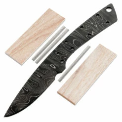 This damascus utility knife kit design is called the “Sports Boot” knife. It is a USA Made carbon steel damascus fixed blade knife blank that is hollow-ground and ready to build. This damascus knife design makes a great utility or concealed-carry knife. The Sports Boot’s design is excellent and has much DIY potential. With a blade length of 3.125 inches and an overall length of 7.50 inches, this design is a perfect EDC carry size. Ground on both sides, the Sports Boot blade is 1.00 inches wide. This damascus blade blank features (8) 0.125 inches (stainless steel pinstock included) and (1) 0.250 inch through-holes for handle construction. The tang holes can be modified with ease to work with larger pinstock, or with threaded fasteners.