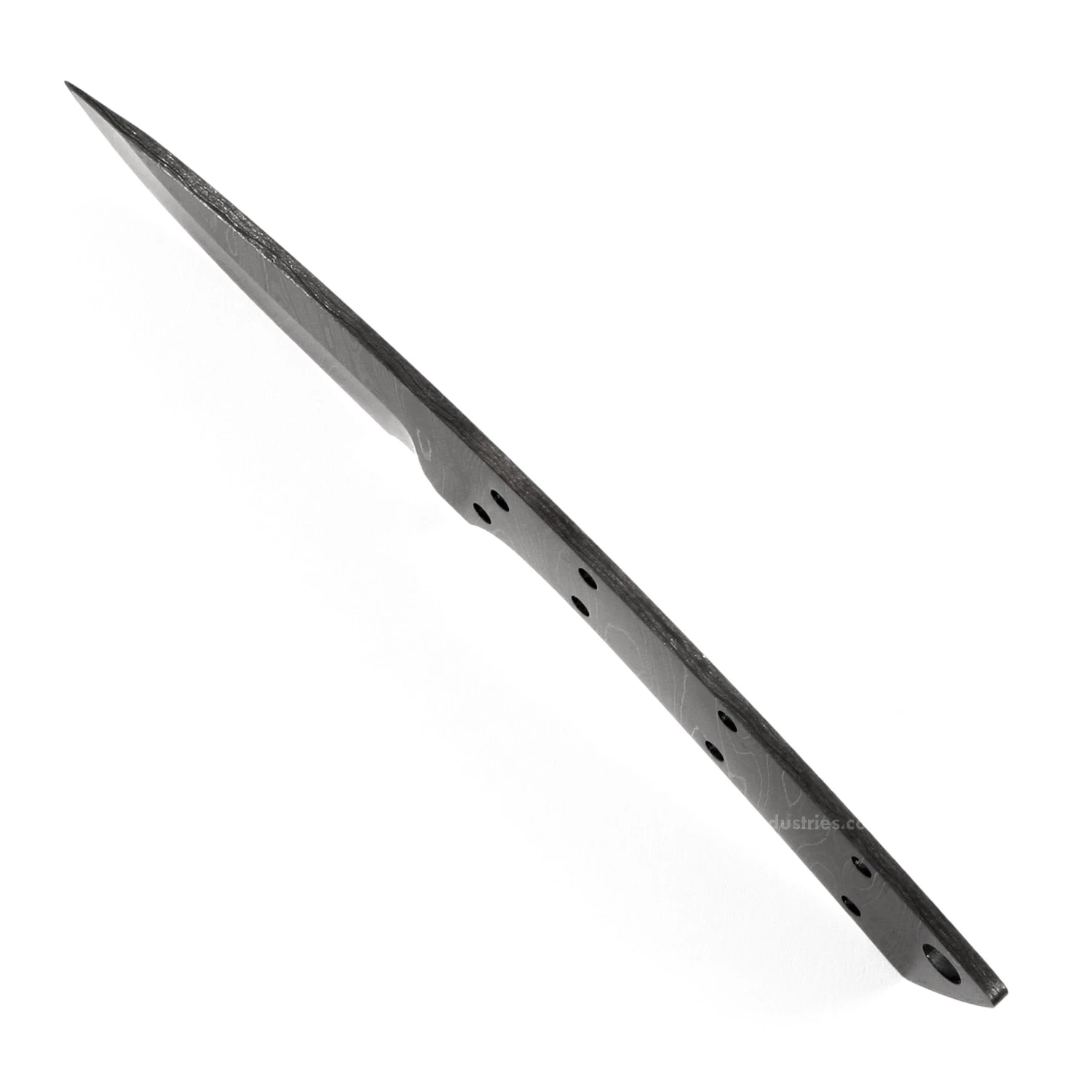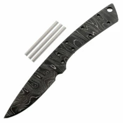 This damascus utility knife kit design is called the “Sports Boot” knife. It is a USA Made carbon steel damascus fixed blade knife blank that is hollow-ground and ready to build. This damascus knife design makes a great utility or concealed-carry knife. The Sports Boot’s design is excellent and has much DIY potential. With a blade length of 3.125 inches and an overall length of 7.50 inches, this design is a perfect EDC carry size. Ground on both sides, the Sports Boot blade is 1.00 inches wide. This damascus blade blank features (8) 0.125 inches (stainless steel pinstock included) and (1) 0.250 inch through-holes for handle construction. The tang holes can be modified with ease to work with larger pinstock, or with threaded fasteners.