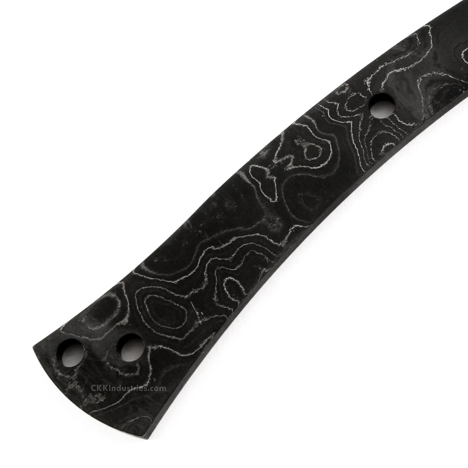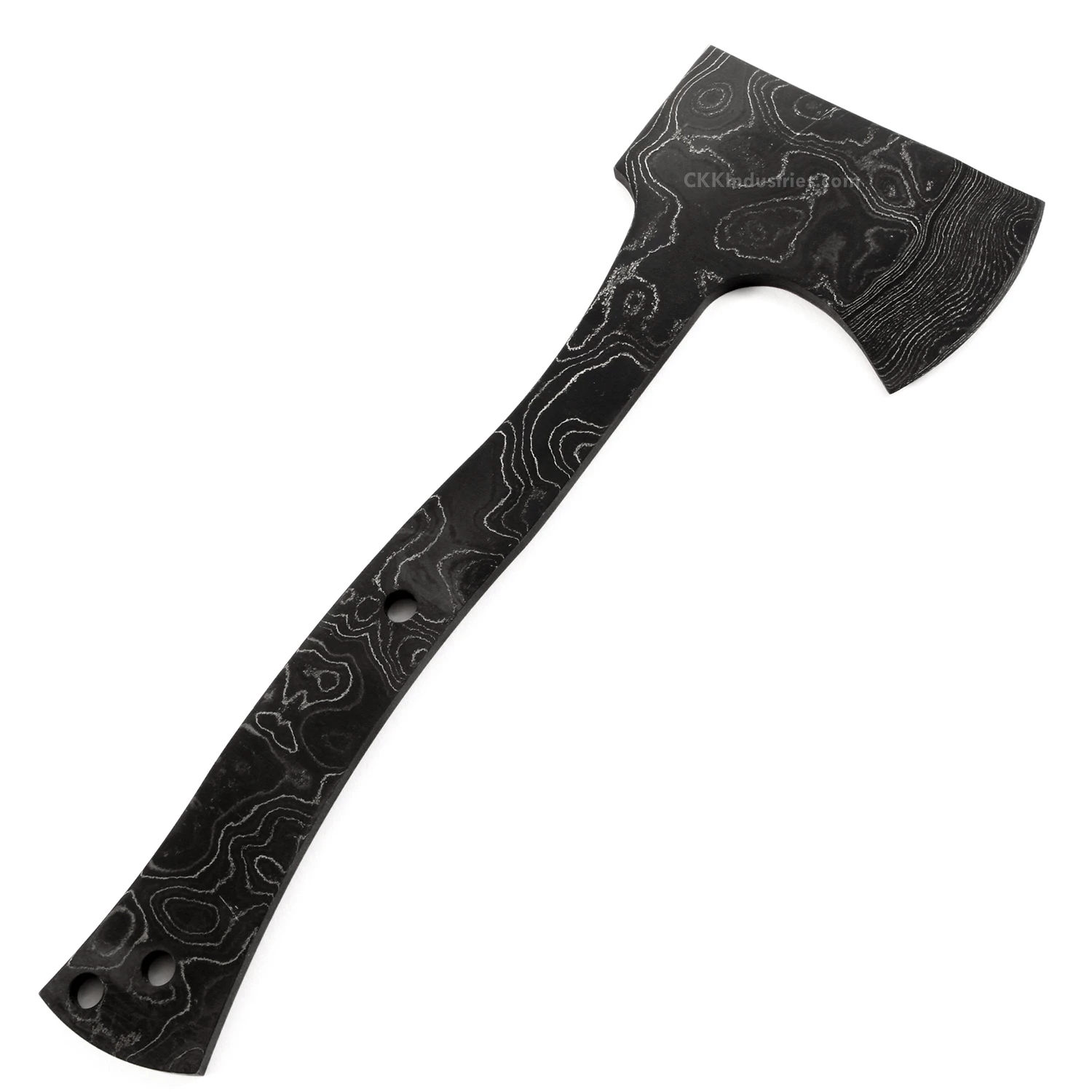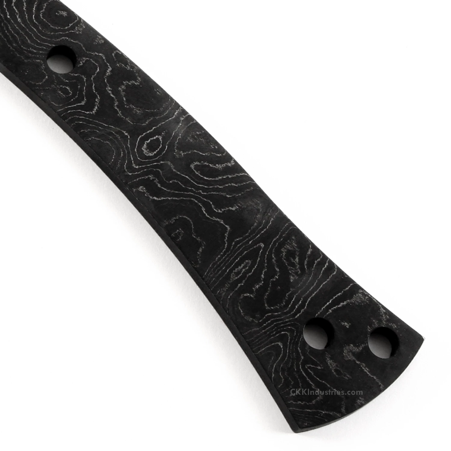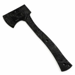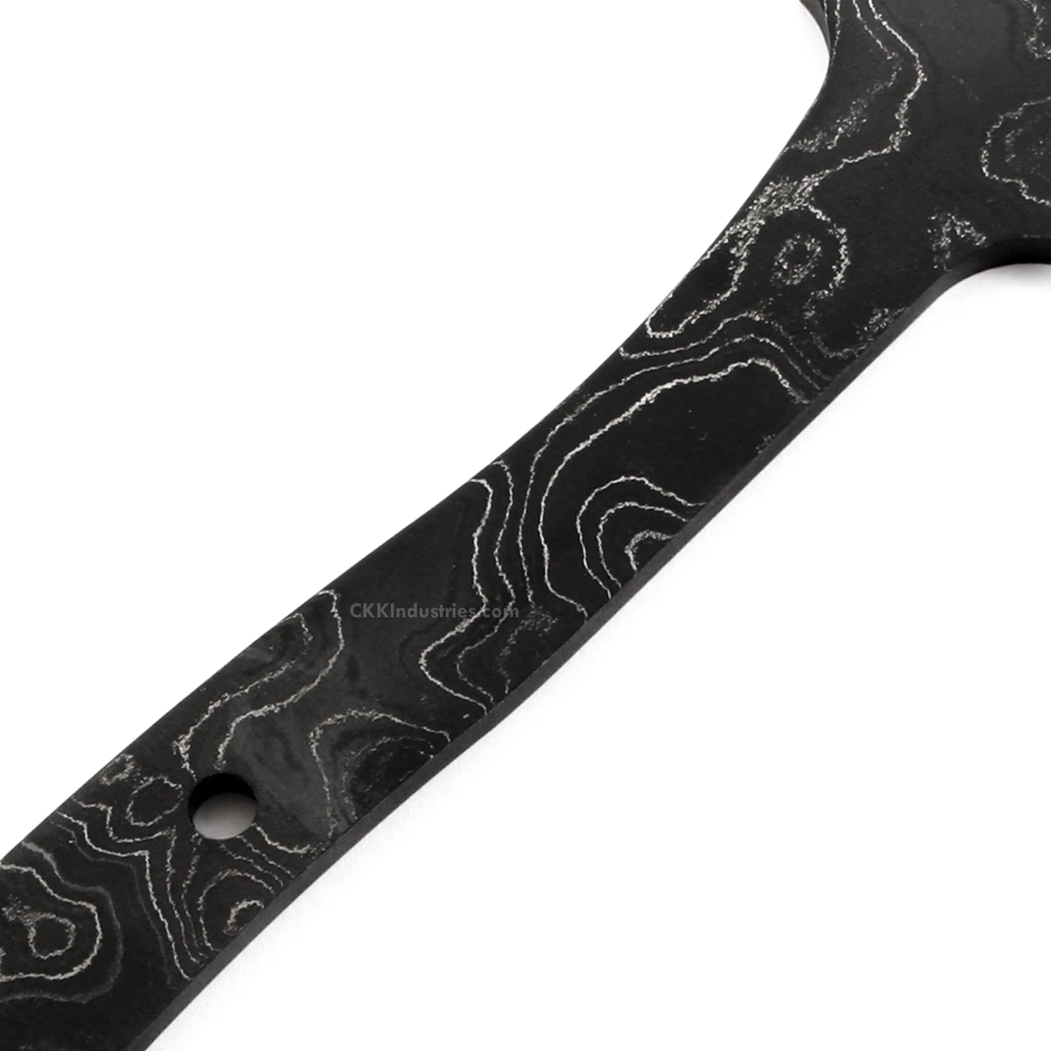 This damascus hatchet blank model features (2) .250″ through holes for handle construction with a .250″ thong hole for an optional lanyard. The tang holes can be modified with ease to work with larger pinstock, or with threaded fasteners. Please see our drills and taps sections for more options.