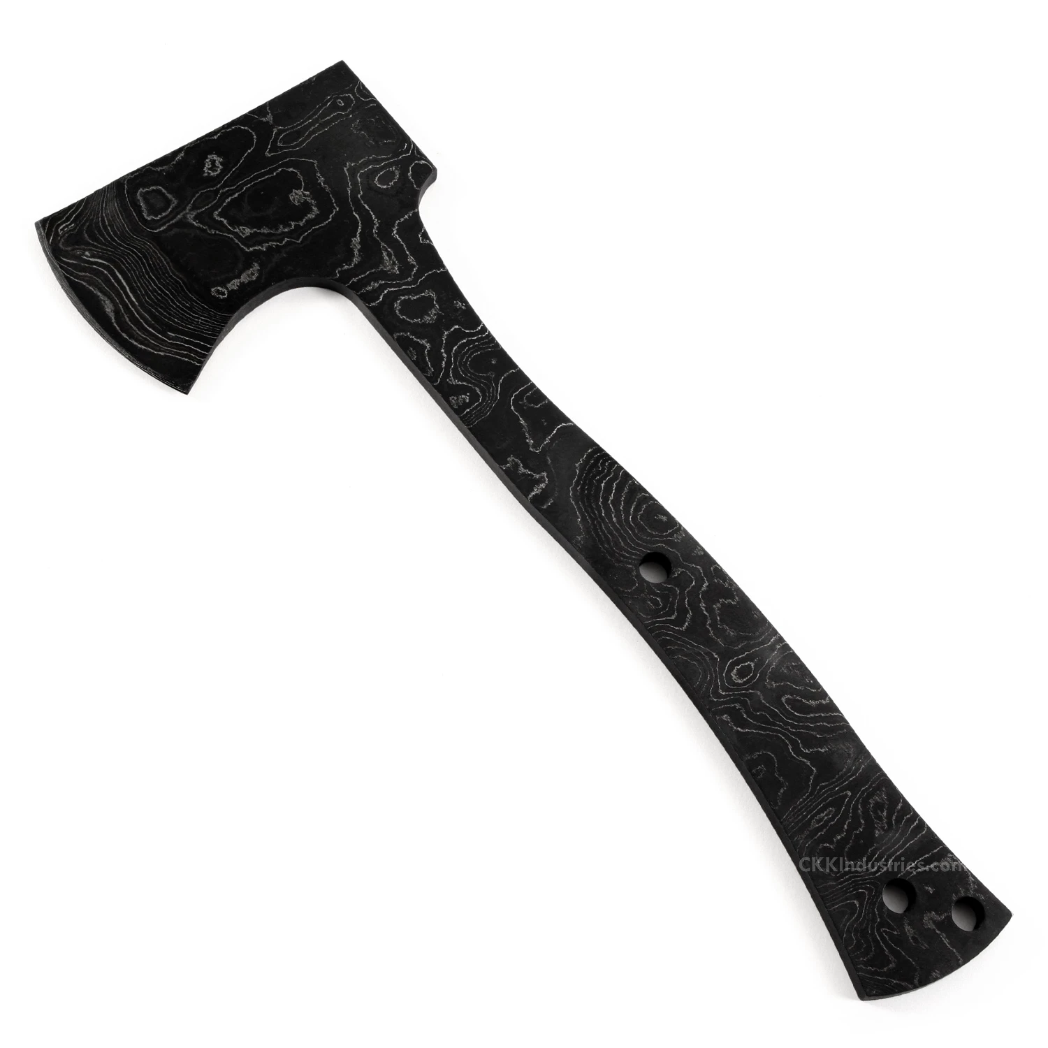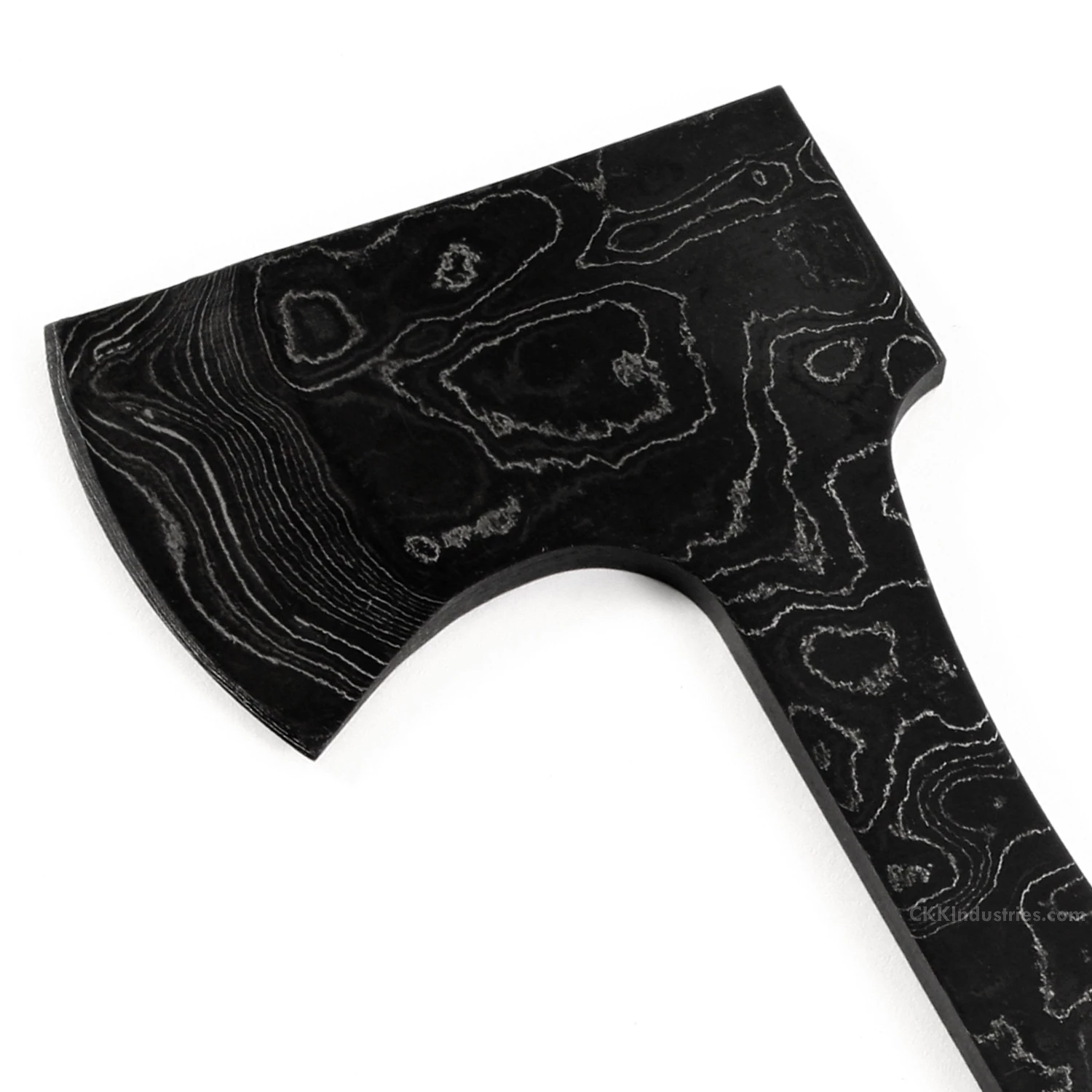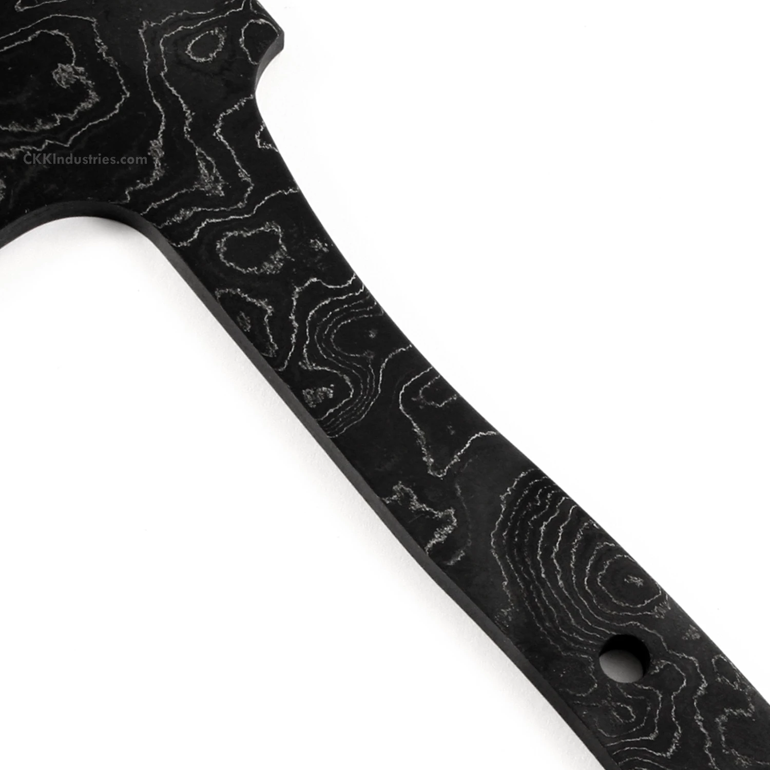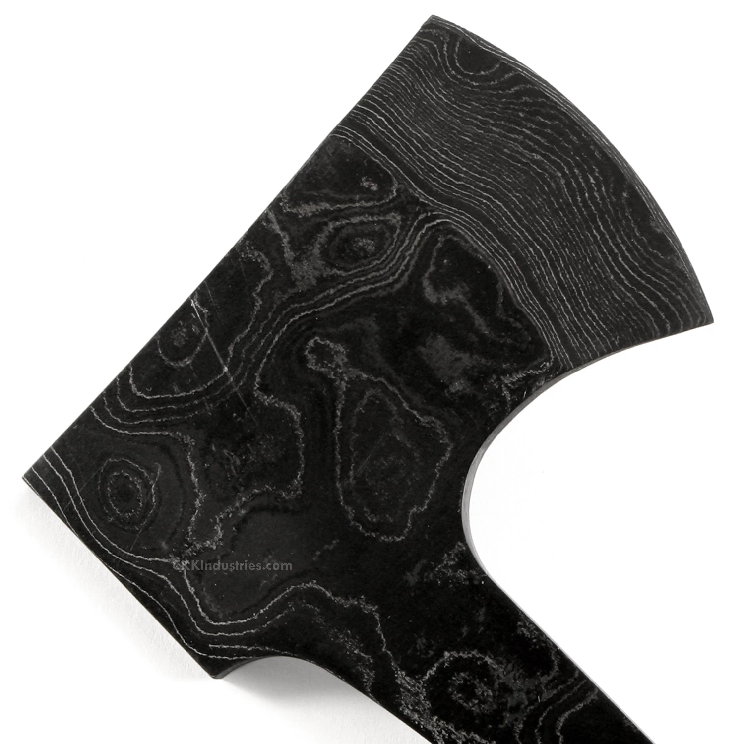 This great looking gent’s damascus hatchet blank is called the “Squire”. It is a USA Made carbon steel damascus integral hatchet blank design that is hollow-ground and ready to build. This damascus hatchet making kit model makes a great personal display piece and can be finished with an unlimited numer of handle treatments. It will also impress as a collectible gift project.