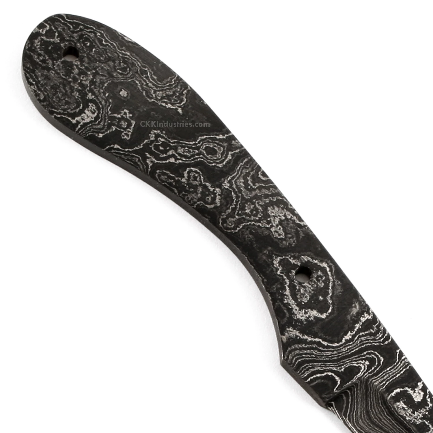 This damascus full tang knife making kit design is called the “Tail Fin”. It is a USA Made carbon steel damascus fixed blade knife blank that is hollow-ground and ready to build. This damascus blade blank model would make a great personal carry utility knife. The straight-forward simplicity of the design also makes this kit blade a great pick as a collectible gift project. With a blade length of 3.25 inches and an overall length of 7 inches, this design even works well as a conceal-carry knife. Ground on both sides, the Tail Fin’s blade is 0.75 inches wide. This damascus blade blank design features (2) 0.125 inch through-holes for handle construction (stainless steel pinstock included). The tang holes on this model can be easily modified to work with larger pinstock or threaded fasteners.