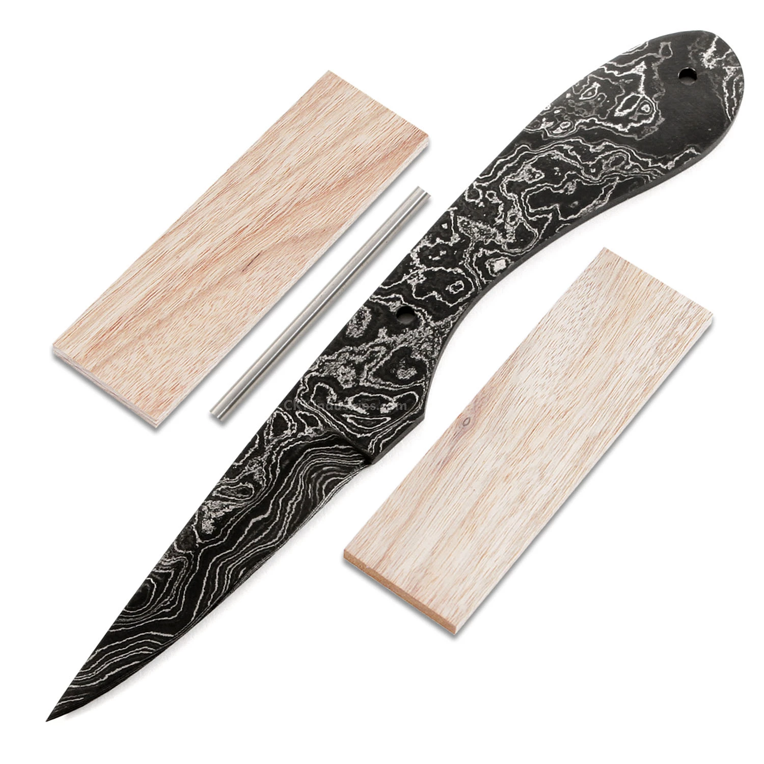This damascus full tang knife making kit design is called the “Tail Fin”. It is a USA Made carbon steel damascus fixed blade knife blank that is hollow-ground and ready to build. This damascus blade blank model would make a great personal carry utility knife. The straight-forward simplicity of the design also makes this kit blade a great pick as a collectible gift project. With a blade length of 3.25 inches and an overall length of 7 inches, this design even works well as a conceal-carry knife. Ground on both sides, the Tail Fin’s blade is 0.75 inches wide. This damascus blade blank design features (2) 0.125 inch through-holes for handle construction (stainless steel pinstock included). The tang holes on this model can be easily modified to work with larger pinstock or threaded fasteners.