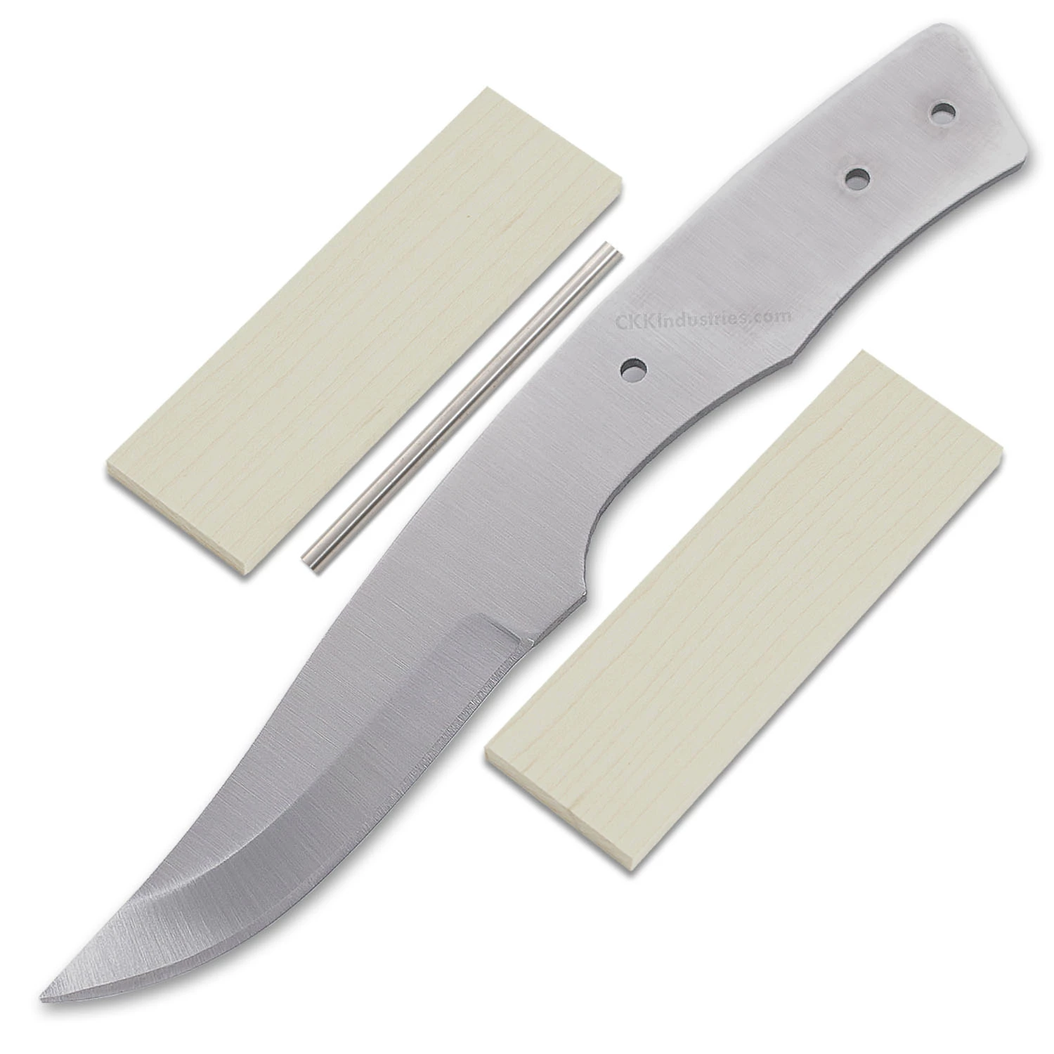 This high carbon trailing point knife blade design is called “The Talon”. Made in the USA, it is a 1075 high carbon steel fixed blade knife blank that is hollow-ground and ready to build. This high carbon trailing point design makes a fantastic custom carry, utility-style knife. With a blade length of 3 inches and an overall length of 7.50 inches, this design is a perfect carry size. Ground on both sides, the Talon’s blade is .950 inches wide with a .130 inch thickness. This high carbon trailing point blade design features (3) .125 inch through-holes for handle construction (stainless steel pinstock included). The tang holes on this model can be modified to work with larger pinstock, or with threaded fasteners. Please see our Knife Making Tools and Parts sections for more options for handle hole enlargement. This version of the Talon is the combo kit. It comes with the Talon blade plus Curly Maple handle scales and stainless steel pinstock to simplify the completion process. This is a great project blade for a weekend knife making session. Spend some quality workshop time with this knife kit and enjoy the fun of custom knife making and customization.