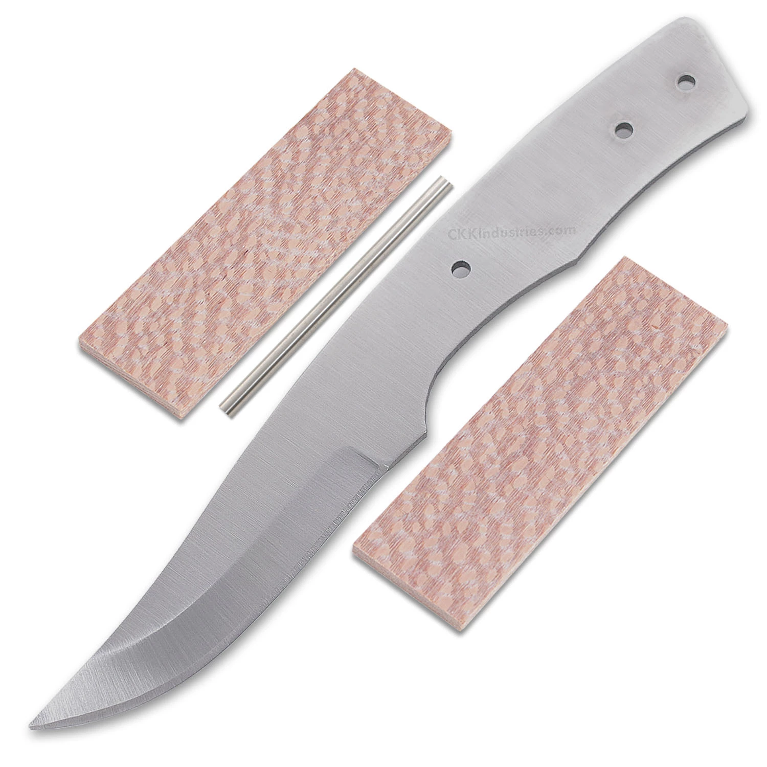 This high carbon trailing point knife blade design is called “The Talon”. Made in the USA, it is a 1075 high carbon steel fixed blade knife blank that is hollow-ground and ready to build. This high carbon trailing point design makes a fantastic custom carry, utility-style knife. With a blade length of 3 inches and an overall length of 7.50 inches, this design is a perfect carry size. Ground on both sides, the Talon’s blade is .950 inches wide with a .130 inch thickness. This high carbon trailing point blade design features (3) .125 inch through-holes for handle construction (stainless steel pinstock included). The tang holes on this model can be modified to work with larger pinstock, or with threaded fasteners. Please see our Knife Making Tools and Parts sections for more options for handle hole enlargement. This version of the Talon is the combo kit. It comes with the Talon blade plus Lacewood handle scales and stainless steel pinstock to simplify the completion process. This is a great project blade for a weekend knife making session. Spend some quality workshop time with this knife kit and enjoy the fun of custom knife making and customization.