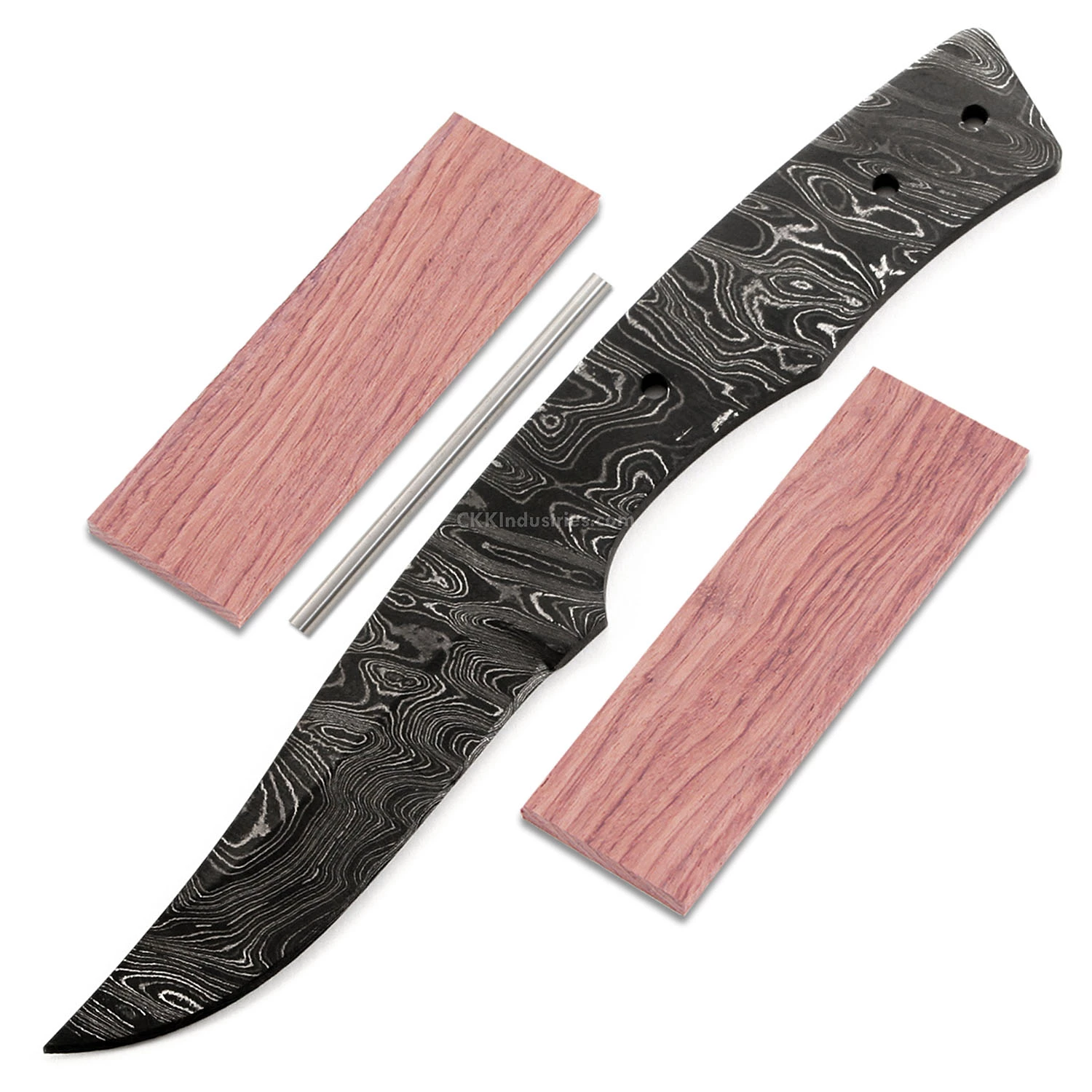 This damascus trailing point knife blade design is called “The Talon”. The Talon is a USA-made, carbon steel damascus fixed blade that is hollow-ground and ready to build. This damascus trailing point blade design makes a fantastic utility knife or hunter. With a blade length of 3.00 inches and an overall length of 7.50 inches, this design is a perfect carry size for everyday use. Ground on both sides, the Talon’s blade is .950 inches wide with a .130 inch thickness. This damascus blade design features (3) .125 inch through-holes for handle construction (stainless steel pinstock included). The tang holes can be modified to work with larger pinstock, or with threaded fasteners. Please see our Knife Making Tools and Parts categories for more handle fastening options. This version of the Talon is the combo kit. It comes with the Talon blade plus Bubinga handle scales and stainless steel pinstock to simplify the completion process. This is a great project blade for a weekend knife making session. Spend some quality workshop time with this skinning knife kit and enjoy the fun of custom knife making and customization.