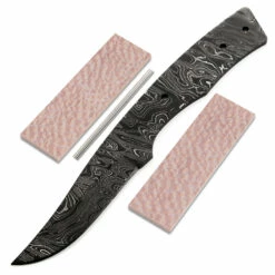 This damascus trailing point knife blade design is called “The Talon”. The Talon is a USA-made, carbon steel damascus fixed blade that is hollow-ground and ready to build. This damascus trailing point blade design makes a fantastic utility knife or hunter. With a blade length of 3.00 inches and an overall length of 7.50 inches, this design is a perfect carry size for everyday use. Ground on both sides, the Talon’s blade is .950 inches wide with a .130 inch thickness. This damascus blade design features (3) .125 inch through-holes for handle construction (stainless steel pinstock included). The tang holes can be modified to work with larger pinstock, or with threaded fasteners. Please see our Knife Making Tools and Parts categories for more handle fastening options. This version of the Talon is the combo kit. It comes with the Talon blade plus Lacewood handle scales and stainless steel pinstock to simplify the completion process. This is a great project blade for a weekend knife making session. Spend some quality workshop time with this skinning knife kit and enjoy the fun of custom knife making and customization.