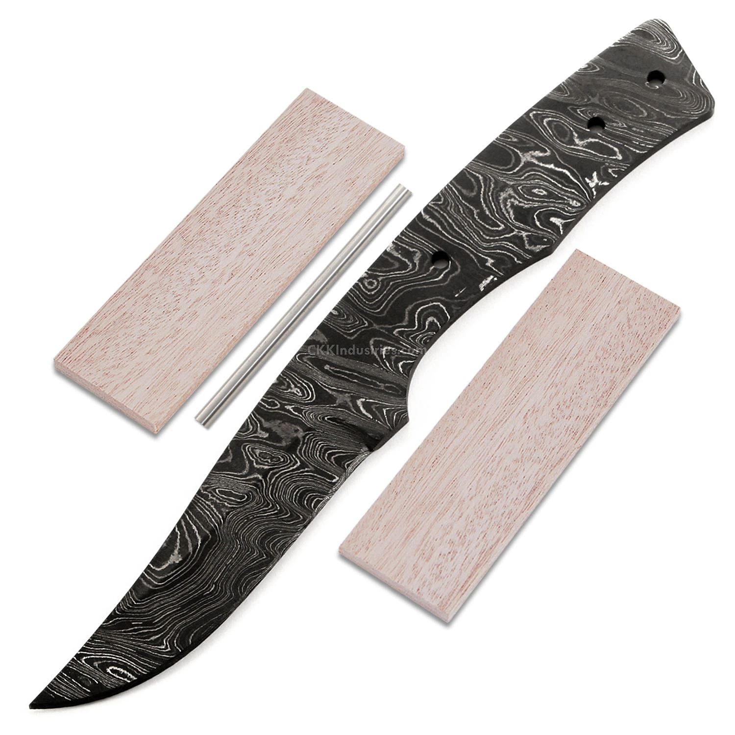 This damascus trailing point knife blade design is called “The Talon”. The Talon is a USA-made, carbon steel damascus fixed blade that is hollow-ground and ready to build. This damascus trailing point blade design makes a fantastic utility knife or hunter. With a blade length of 3.00 inches and an overall length of 7.50 inches, this design is a perfect carry size for everyday use. Ground on both sides, the Talon’s blade is .950 inches wide with a .130 inch thickness. This damascus blade design features (3) .125 inch through-holes for handle construction (stainless steel pinstock included). The tang holes can be modified to work with larger pinstock, or with threaded fasteners. Please see our Knife Making Tools and Parts categories for more handle fastening options. This version of the Talon is the combo kit. It comes with the Talon blade plus Mahogany handle scales and stainless steel pinstock to simplify the completion process. This is a great project blade for a weekend knife making session. Spend some quality workshop time with this skinning knife kit and enjoy the fun of custom knife making and customization.