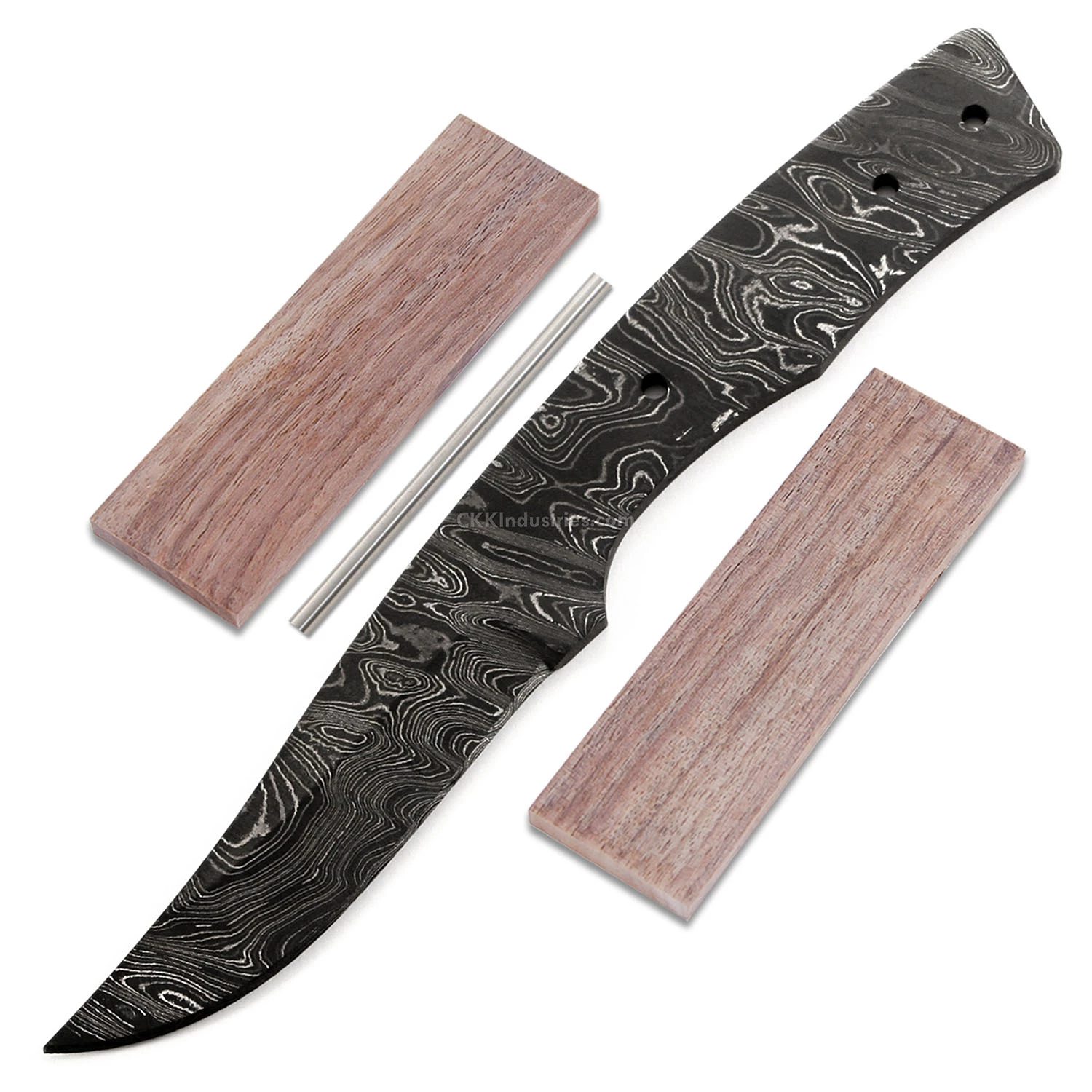 This damascus trailing point knife blade design is called “The Talon”. The Talon is a USA-made, carbon steel damascus fixed blade that is hollow-ground and ready to build. This damascus trailing point blade design makes a fantastic utility knife or hunter. With a blade length of 3.00 inches and an overall length of 7.50 inches, this design is a perfect carry size for everyday use. Ground on both sides, the Talon’s blade is .950 inches wide with a .130 inch thickness. This damascus blade design features (3) .125 inch through-holes for handle construction (stainless steel pinstock included). The tang holes can be modified to work with larger pinstock, or with threaded fasteners. Please see our Knife Making Tools and Parts categories for more handle fastening options. This version of the Talon is the combo kit. It comes with the Talon blade plus Walnut handle scales and stainless steel pinstock to simplify the completion process. This is a great project blade for a weekend knife making session. Spend some quality workshop time with this skinning knife kit and enjoy the fun of custom knife making and customization.