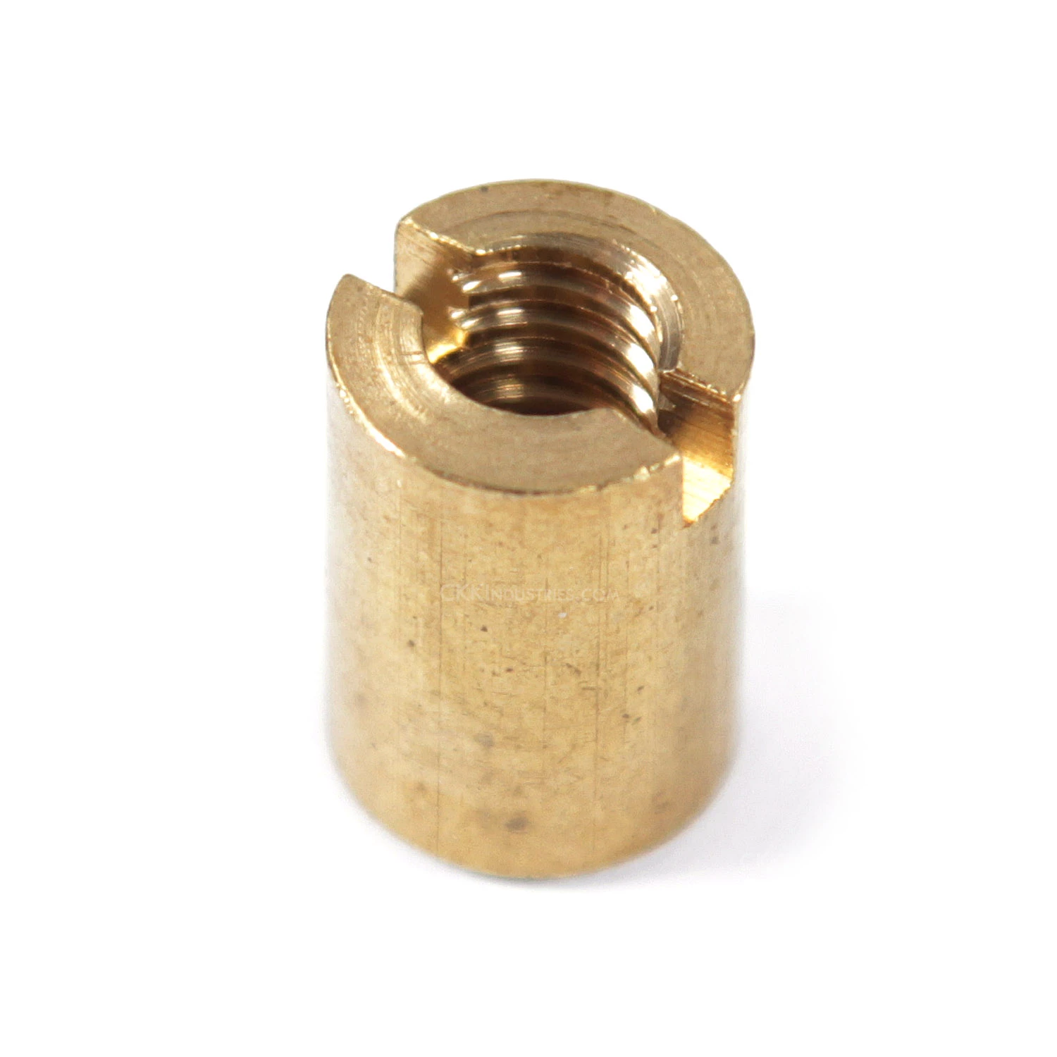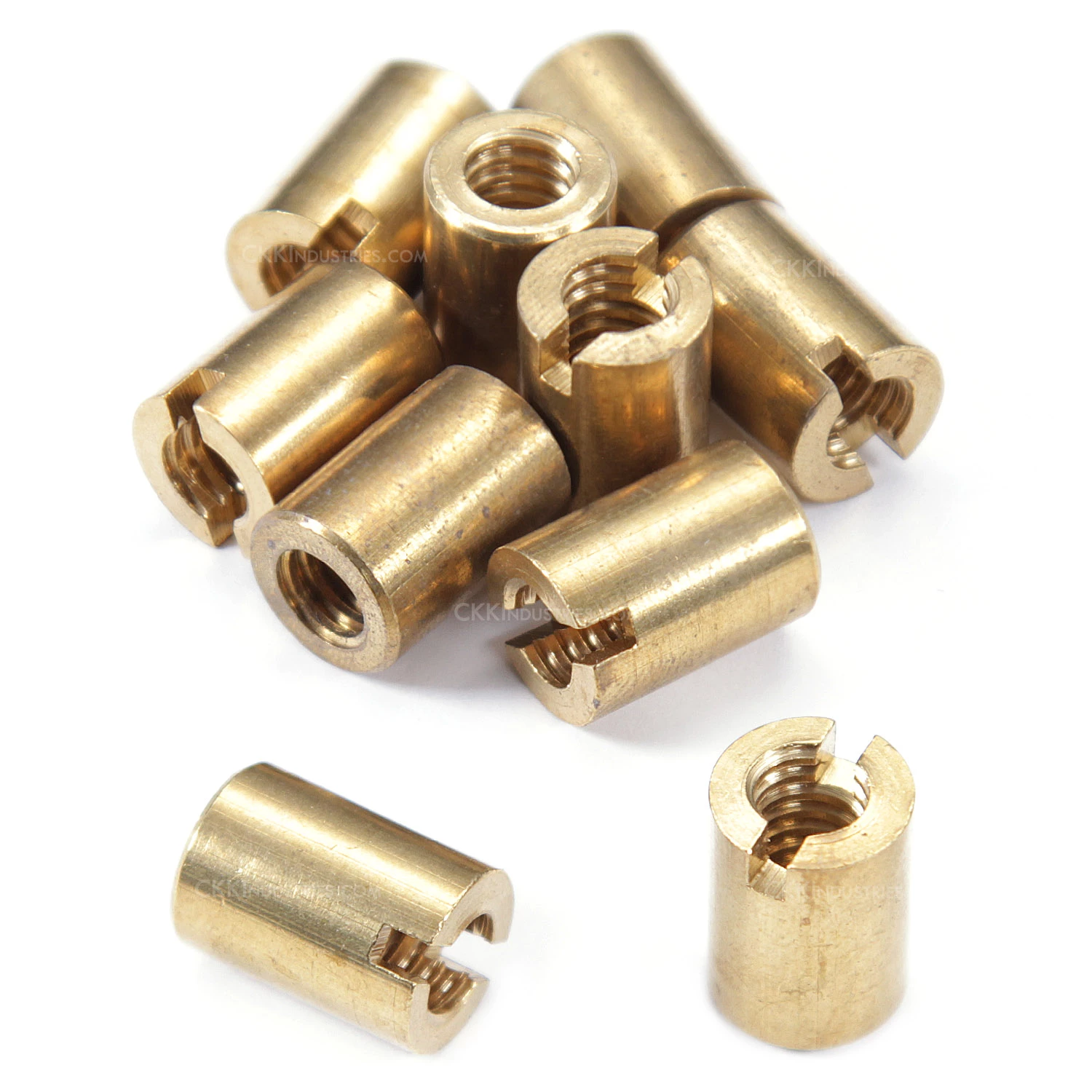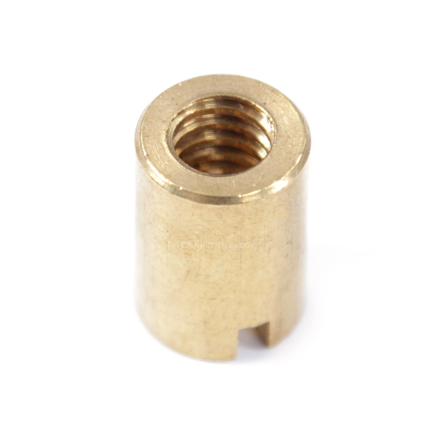This CKK designed brass tang nut fits many of the hidden tang blades on the market today and will also work great on custom hidden tang knife designs. Threaded 1/4-20 (and slotted on one end for tightening-up the handle) this brass tang nut will hold your handle and pommel tight for a secure, attractive finish.