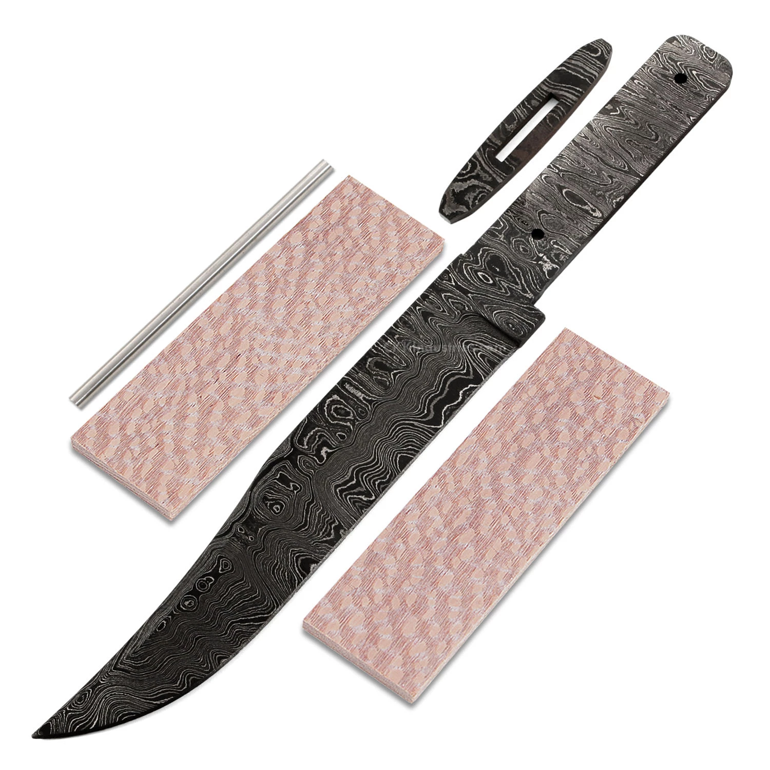This version of the Texas Bowie is the combo kit. It comes with the Texas Bowie knife blade, matching damascus guard, stainless steel pinstock, plus Lacewood handle scales to simplify the completion process. This is an excellent project blade for a weekend knife making session. Spend some quality workshop time with this skinning knife kit and enjoy the fun of custom knife making and customization.