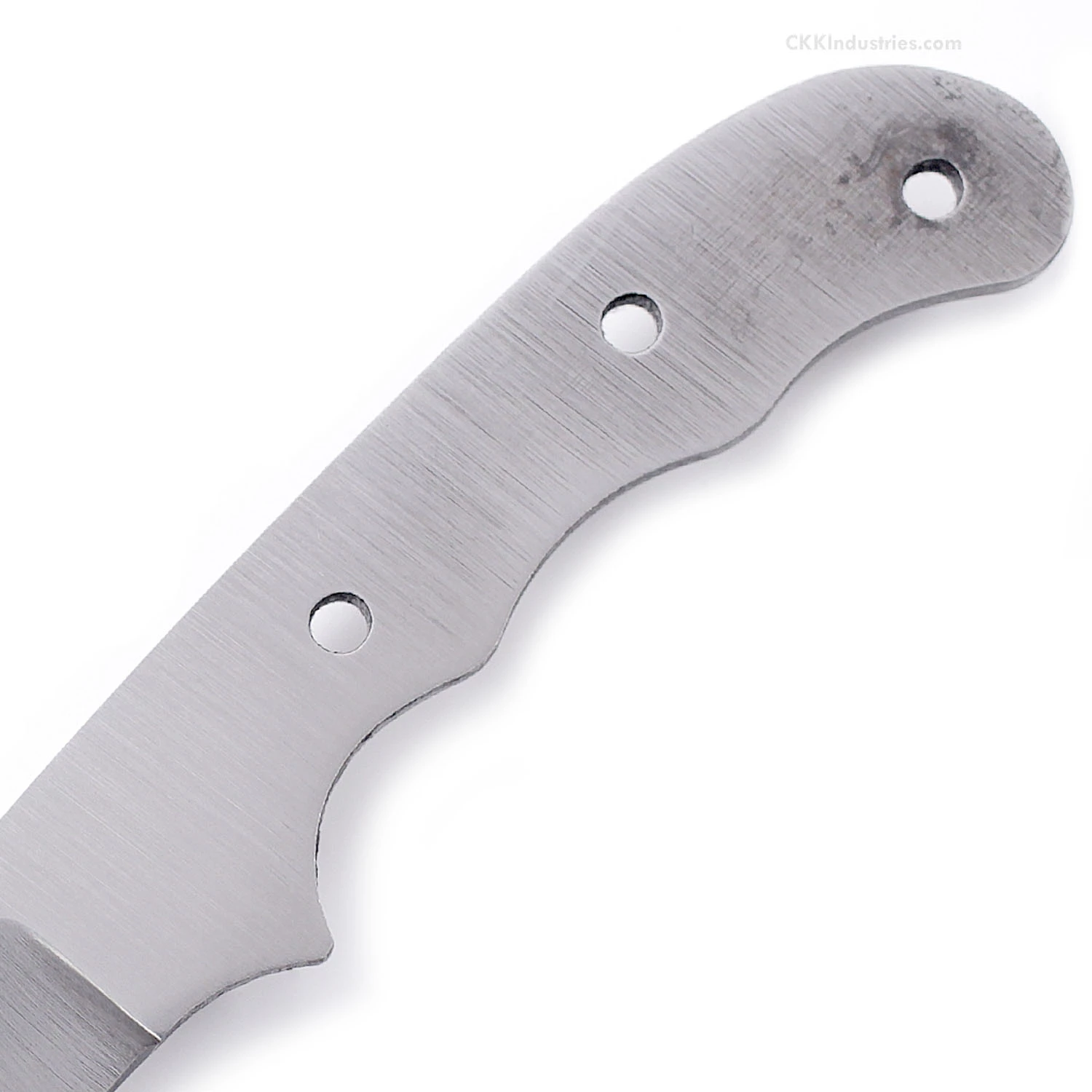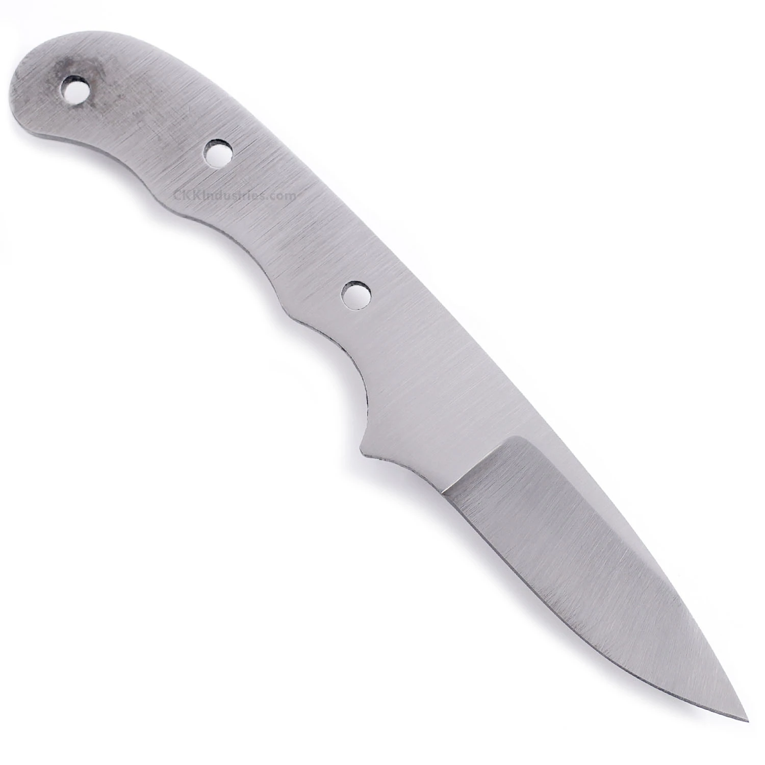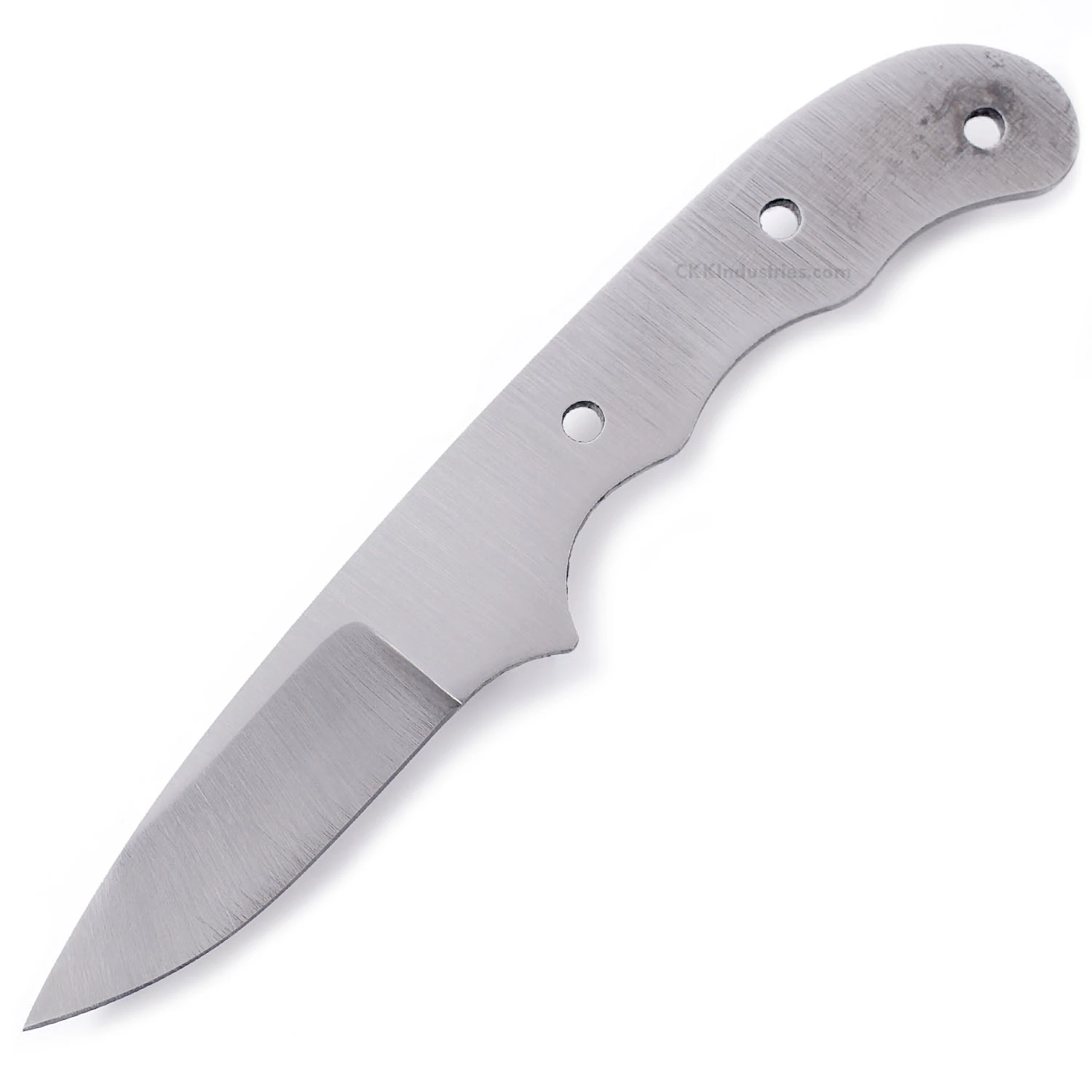 With a blade length of 2-3/8 inches and an overall length of 6-1/4 inches, this design is very popular for self defense. Ground on both sides, the Thrush’s blade is 3/4″ wide. This high carbon drop point blade blank design features (3) .156″ through holes for handle construction. The tang holes can be modified with ease to work with larger pinstock, or with threaded fasteners. Please see our drills and taps sections for more options.