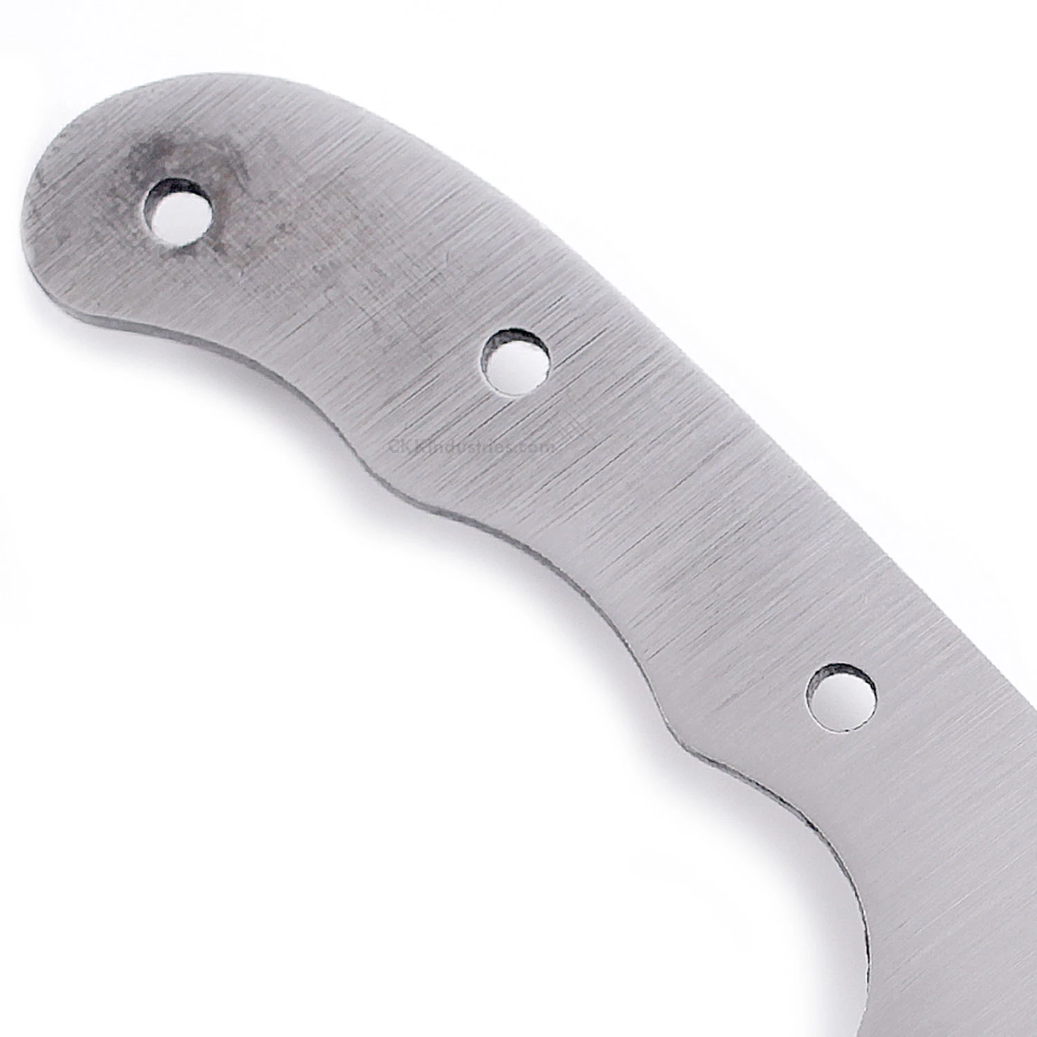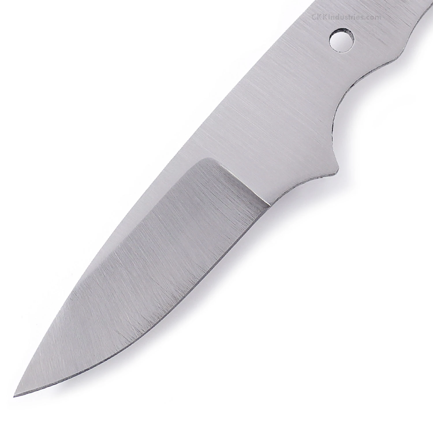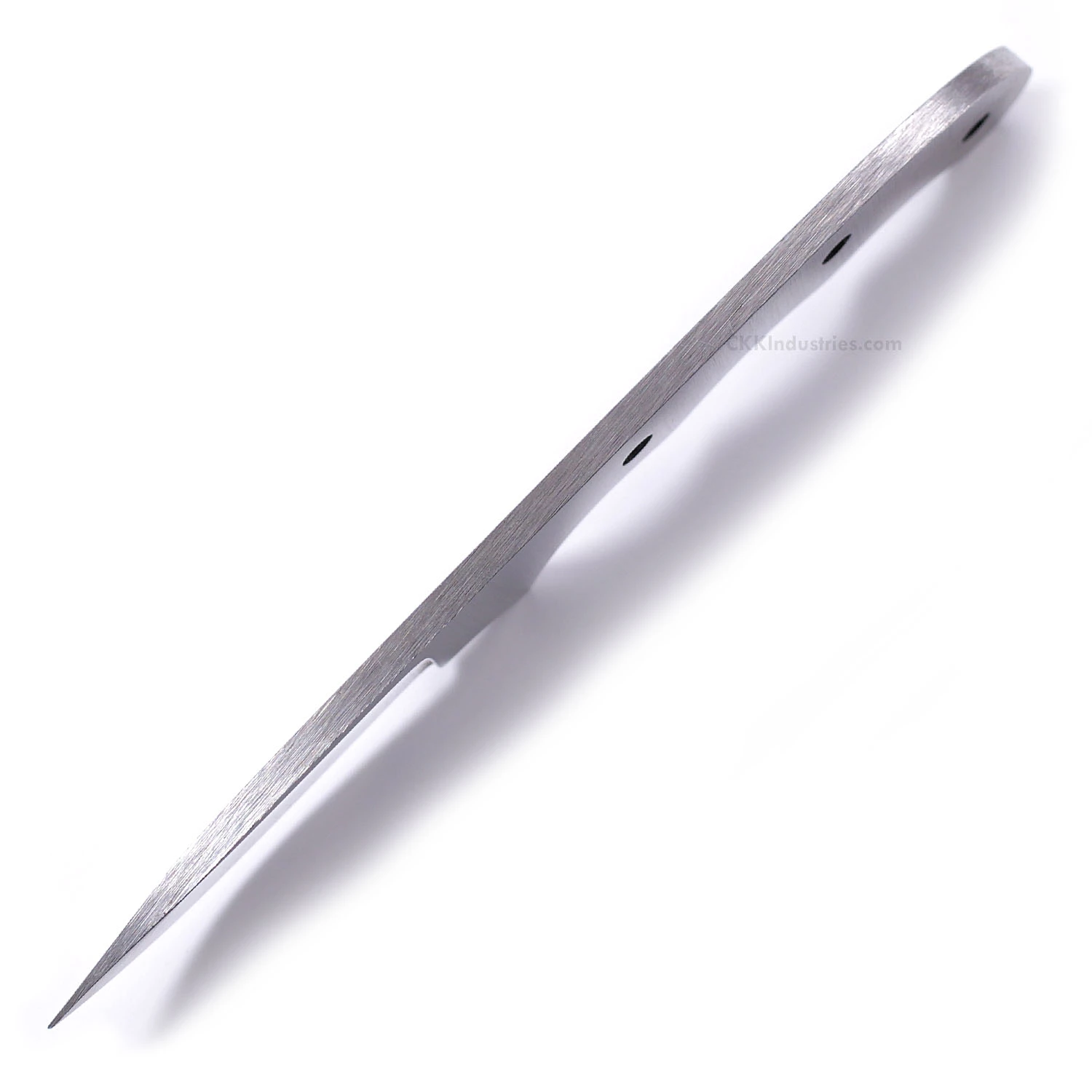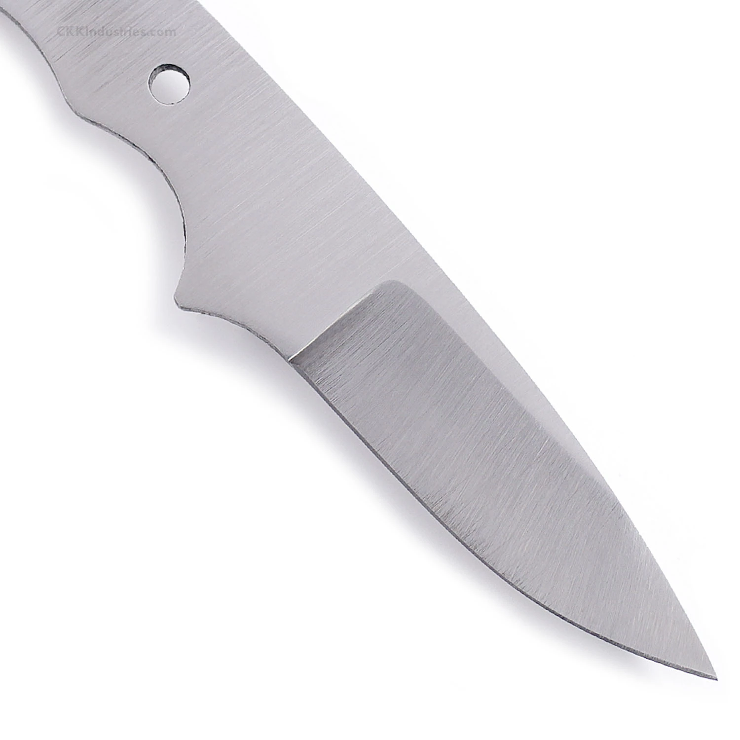 With a blade length of 2-3/8 inches and an overall length of 6-1/4 inches, this design is very popular for self defense. Ground on both sides, the Thrush’s blade is 3/4″ wide. This high carbon drop point blade blank design features (3) .156″ through holes for handle construction. The tang holes can be modified with ease to work with larger pinstock, or with threaded fasteners. Please see our drills and taps sections for more options.