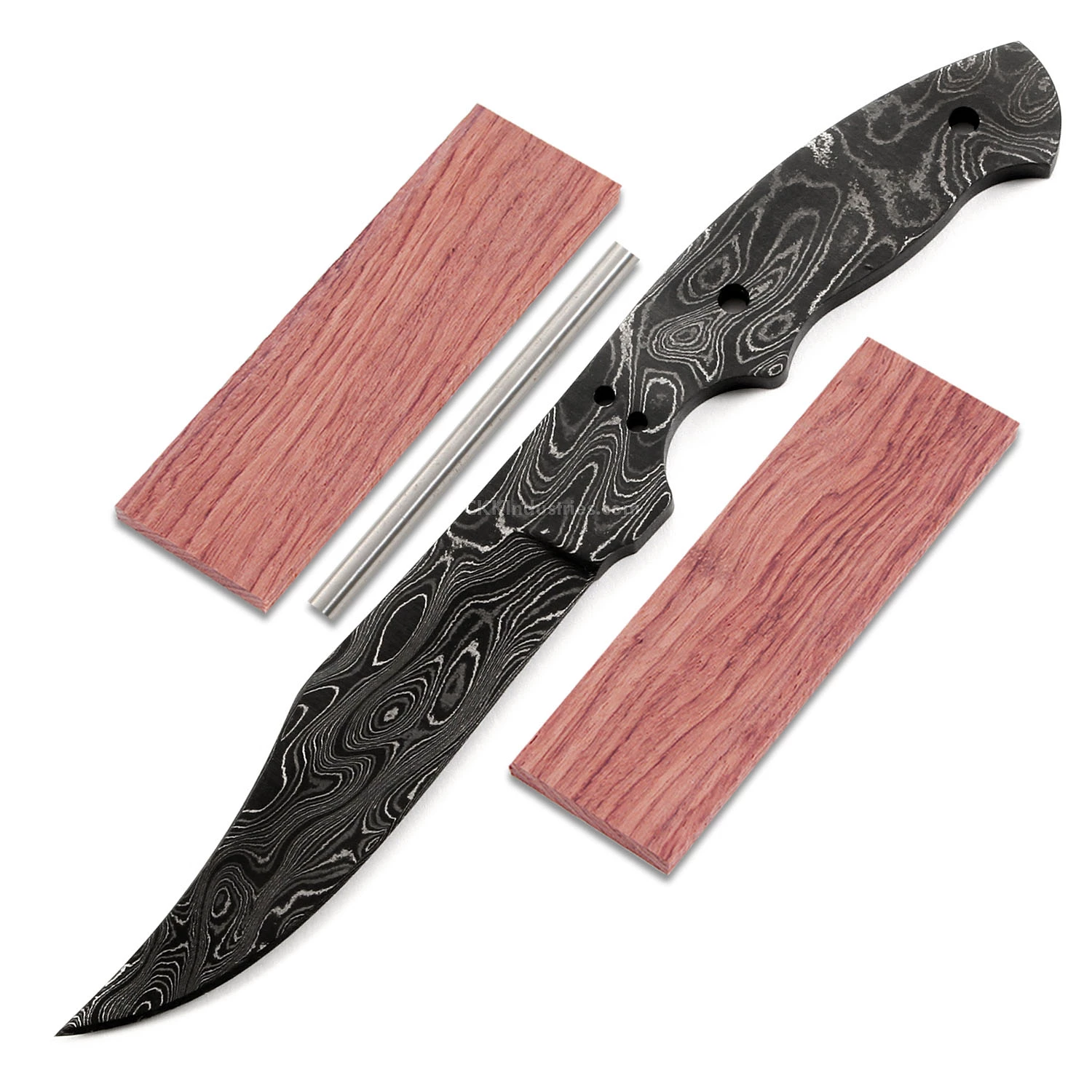 This damascus trailing point knife making kit design is called the “Trail Hand”. It is a USA Made carbon steel damascus fixed blade knife blank that is hollow-ground and ready to build. This trailing point blade blank model will make a fantastic hunting/utility knife, or will serve very well as a collectible gift project. With a blade length of 3.75 inches and an overall length of 8 inches, this design is a perfect carry size. Ground on both sides, the Trail Hand’s blade is .93 inches wide with a .170 inch thickness. This damascus trailing point blade blank features (2) .093 inch and (2) .156 inch through-holes for handle construction (stainless steel pinstock included). The tang holes can be modified with ease to work with larger pinstock, or with threaded fasteners.