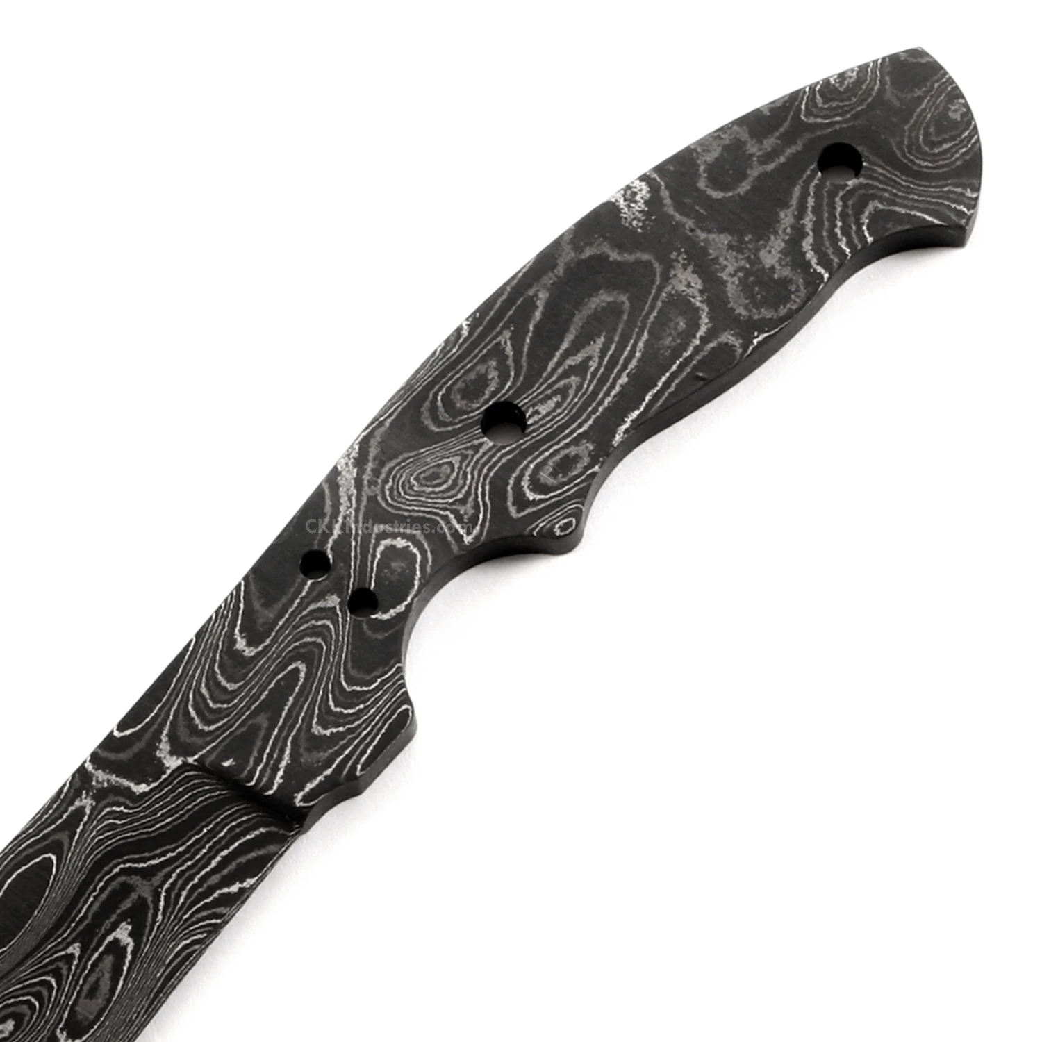 This damascus trailing point knife making kit design is called the “Trail Hand”. It is a USA Made carbon steel damascus fixed blade knife blank that is hollow-ground and ready to build. This trailing point blade blank model will make a fantastic hunting/utility knife, or will serve very well as a collectible gift project. With a blade length of 3.75 inches and an overall length of 8 inches, this design is a perfect carry size. Ground on both sides, the Trail Hand’s blade is .93 inches wide with a .170 inch thickness. This damascus trailing point blade blank features (2) .093 inch and (2) .156 inch through-holes for handle construction (stainless steel pinstock included). The tang holes can be modified with ease to work with larger pinstock, or with threaded fasteners.