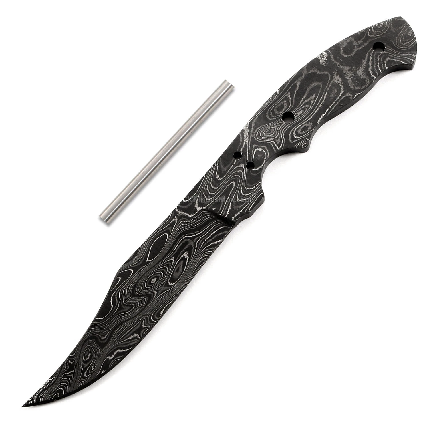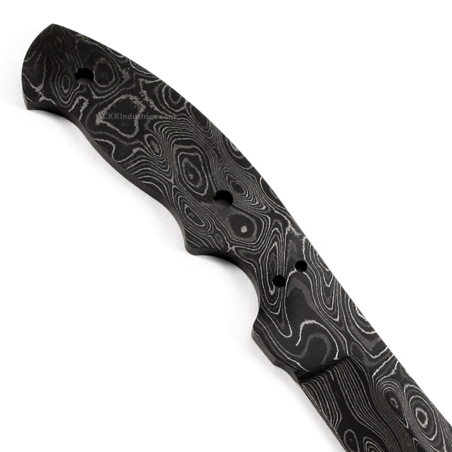 This damascus trailing point knife making kit design is called the “Trail Hand”. It is a USA Made carbon steel damascus fixed blade knife blank that is hollow-ground and ready to build. This trailing point blade blank model will make a fantastic hunting/utility knife, or will serve very well as a collectible gift project. With a blade length of 3.75 inches and an overall length of 8 inches, this design is a perfect carry size. Ground on both sides, the Trail Hand’s blade is .93 inches wide with a .170 inch thickness. This damascus trailing point blade blank features (2) .093 inch and (2) .156 inch through-holes for handle construction (stainless steel pinstock included). The tang holes can be modified with ease to work with larger pinstock, or with threaded fasteners.
