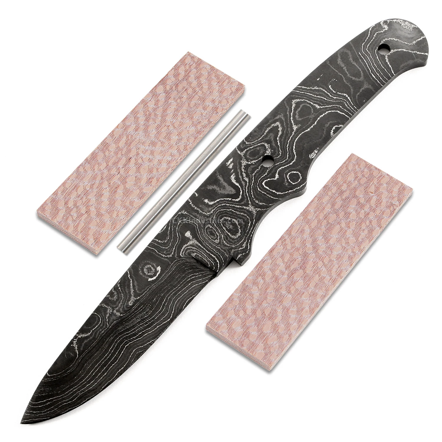 This damscus skinner knife making kit design is called the “Trail Lark”. It is a USA Made carbon steel damascus fixed blade knife blank that is hollow-ground and ready to build. This blade design makes a fantastic personal hunter or skinning knife. The flow of the blade profile is excellent. With a blade length of 3.60 inches and an overall length of 7.90 inches, this design is a perfect carry size. Ground on both sides, the Trail Lark’s blade is 1.06 inches wide. This damscus blade design features (2) .187 inch through-holes for handle construction (stainless steel pinstock included). The tang holes can be modified to work with larger pinstock, or with threaded fasteners. Please see our Knife Making Tools and Parts categories for more handle fastening options. This version of the Trail Lark is the combo kit. It comes with the Trail Lark blade plus Lacewood handle scales and stainless steel pinstock to simplify the completion process. This is a great project blade for a weekend knife making session. Spend some quality workshop time with this skinning knife kit and enjoy the fun of custom knife making and customization.