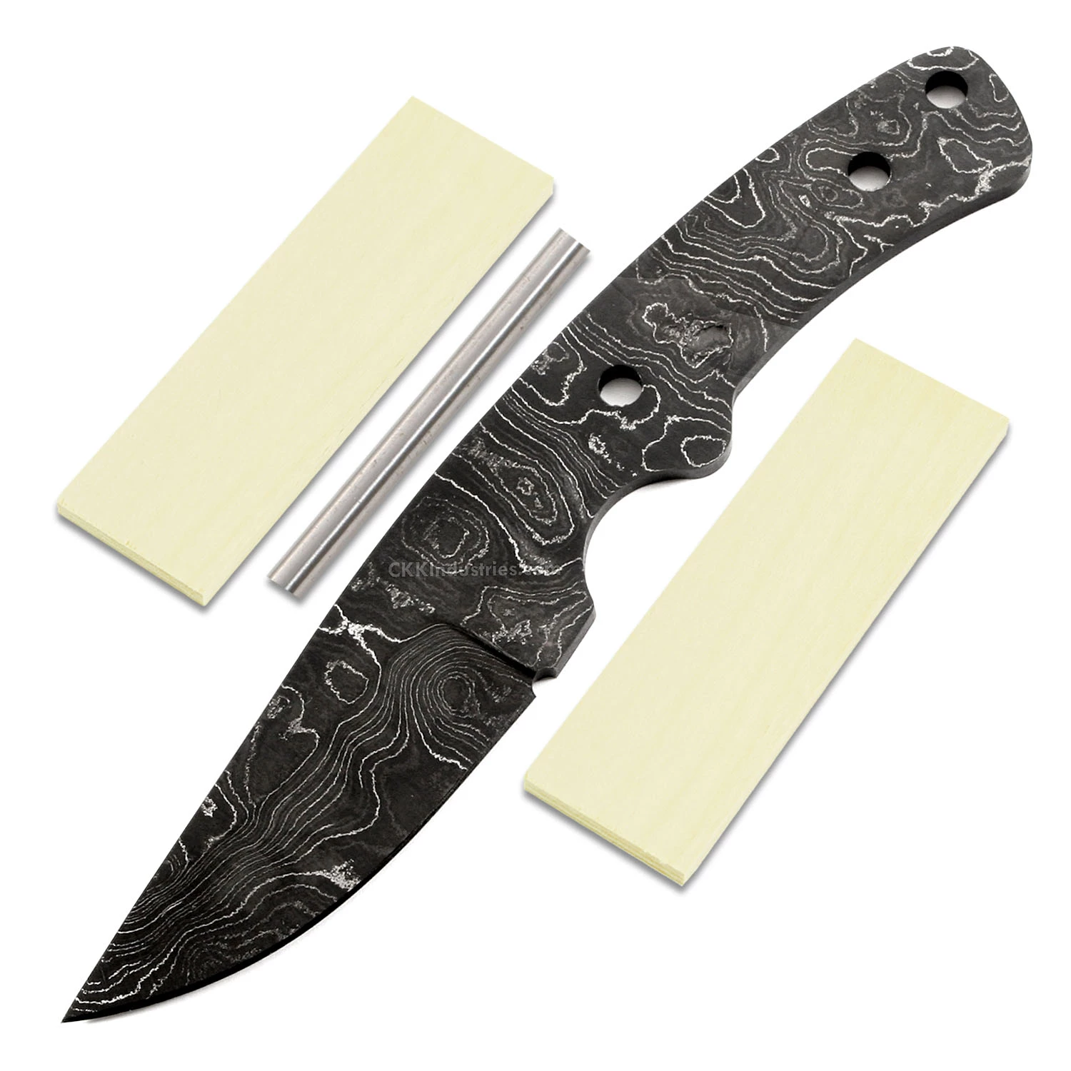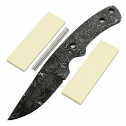 This damascus blade blank is called the “Traveler”. It is a USA Made carbon steel damascus fixed blade knife blank that is hollow-ground and ready to build. This damascus knife kit model will make a fantastic personal hunter or skinning knife. The flow of the design is excellent and the balance is spot on. With a blade length of 3.00 inches and an overall length of 7.60 inches, this design is a perfect carry size. Ground on both sides, the Traveler’s blade is 1.187 inches wide. This damscus blade blank design features (3) 0.250 inch through-holes for handle construction (stainless steel pinstock included). The tang holes can be modified with ease to work with larger pinstock, or with threaded fasteners.
