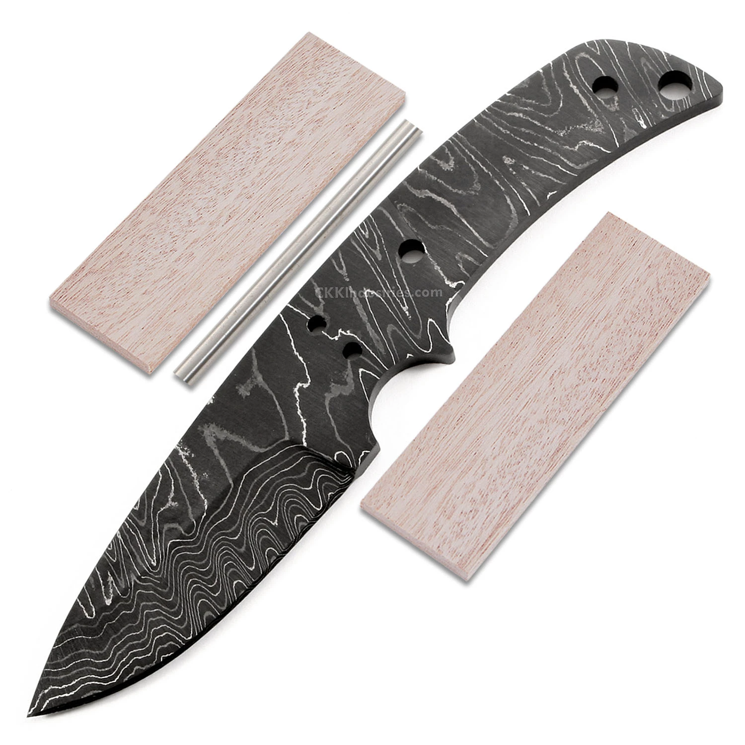 This damascus skinner blade blank design is called the “USA Skinner”. It is a USA Made carbon steel damascus fixed blade knife blank that is hollow-ground and ready to build. This damascus skinning knife making kit model makes a fantastic personal carry knife. It also makes a great collectible gift project. The USA Skinner damascus blade blank has a blade length of 2.625 inches and an overall length of 6.875 inches. Ground on both sides, the blade is 1.187 inches wide. This damascus skinning knife blank design features (2) 0.125 inches and (2) 0.187 inch through-holes for handle construction with a 0.250 inch thong hole for an optional lanyard. The tang holes can be modified with ease to work with larger pinstock, or with threaded fasteners.