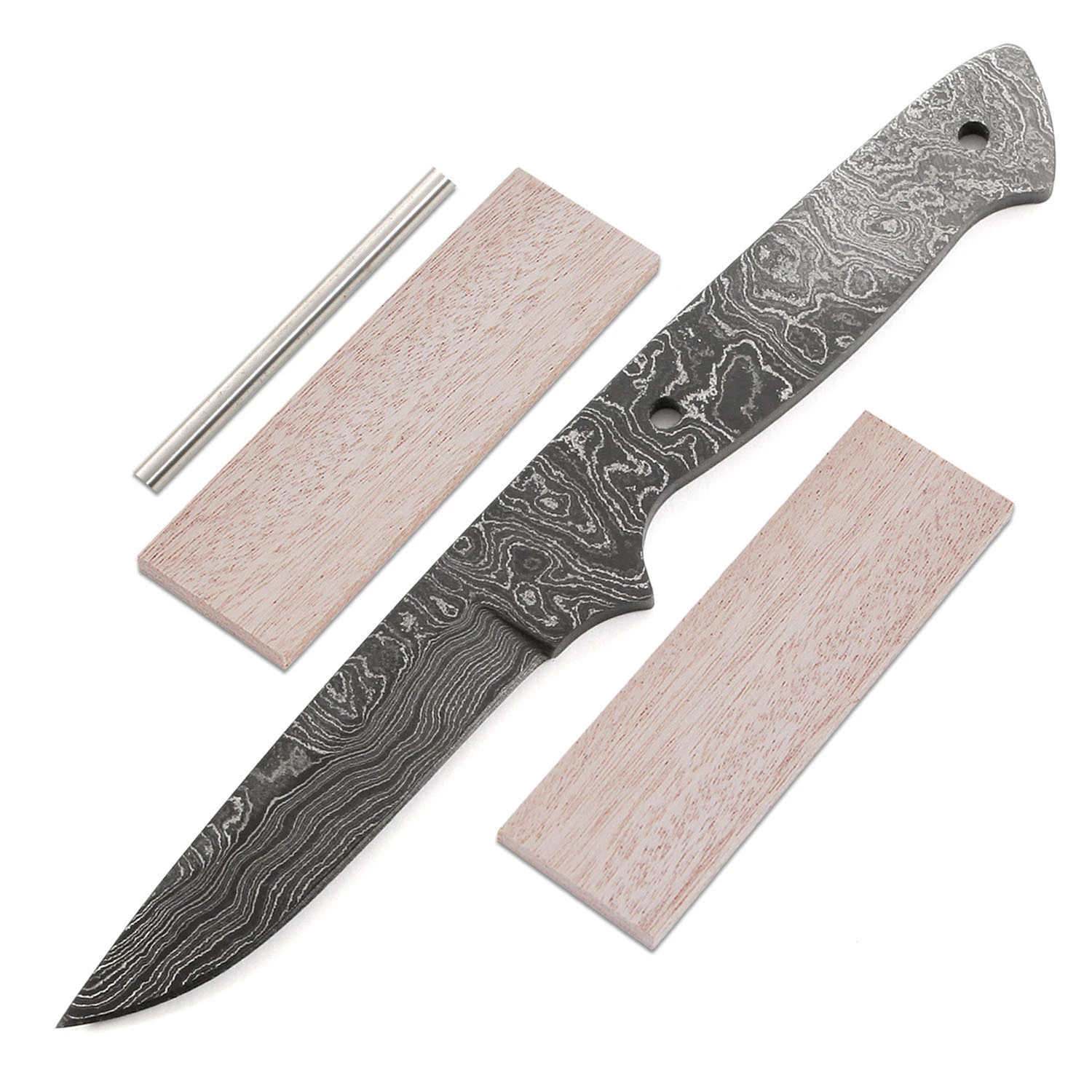 This damascus boot knife kit design is called the “Vegas Boot”. It is a USA Made carbon steel damascus fixed blade that is hollow-ground and ready to build. This damascus boot knife blank model makes a fantastic conceal carry knife, or something fully capable as a small utility design. The Vegas Boot damascus blade blank has a blade length of 3 inches and an overall length of 7 inches. Ground on both sides, the blade is 0.75 inches wide. This damascus boot blade blank design features (2) 0.156 inch through-holes for handle construction (stainless steel pinstock included). The tang holes can be modified with ease to work with larger pinstock, or with threaded fasteners.