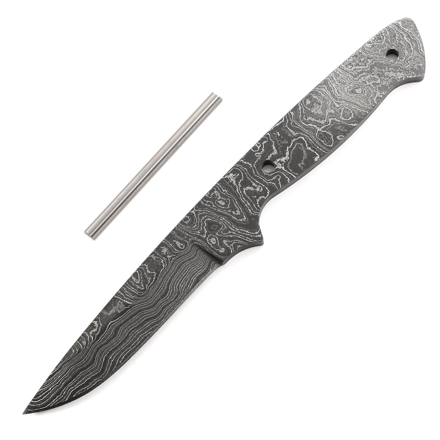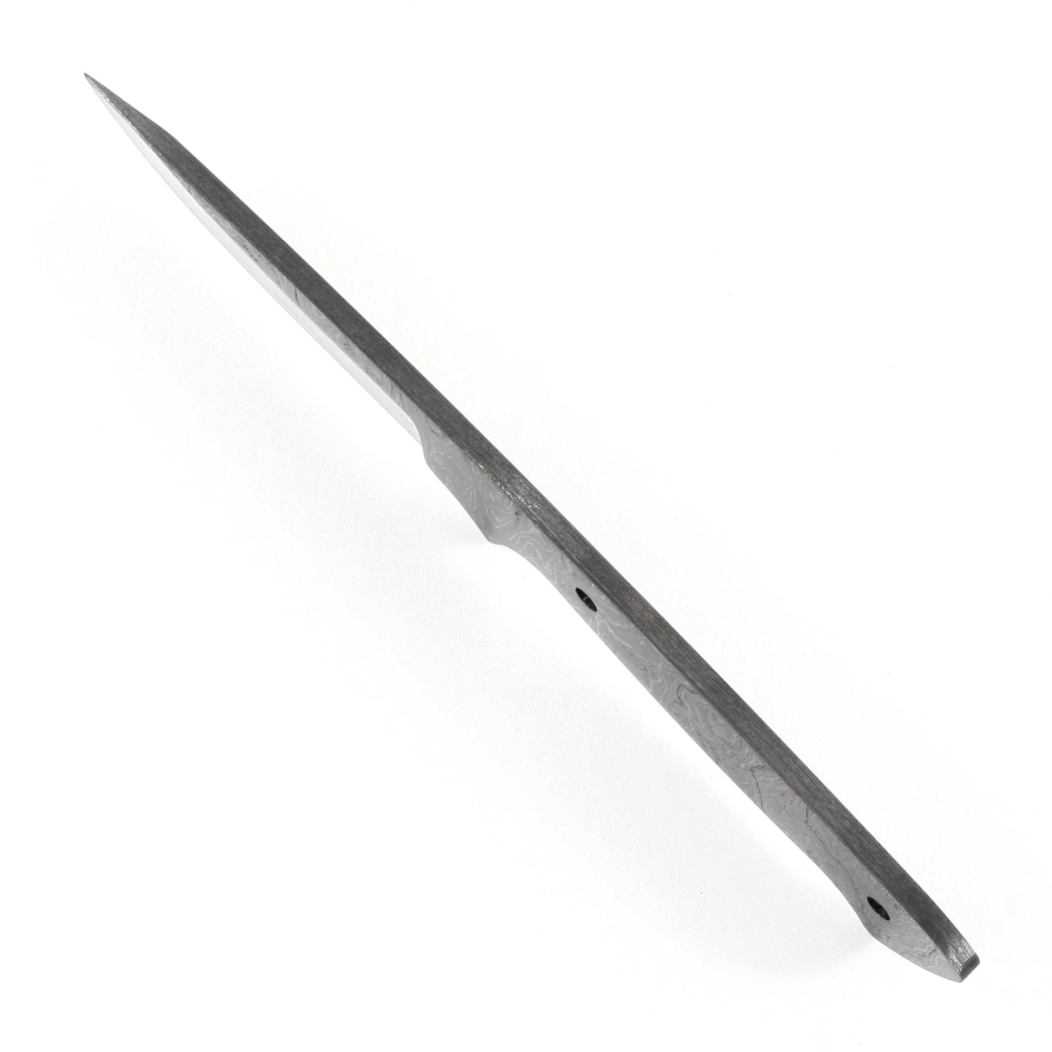 This damascus boot knife kit design is called the “Vegas Boot”. It is a USA Made carbon steel damascus fixed blade that is hollow-ground and ready to build. This damascus boot knife blank model makes a fantastic conceal carry knife, or something fully capable as a small utility design. The Vegas Boot damascus blade blank has a blade length of 3 inches and an overall length of 7 inches. Ground on both sides, the blade is 0.75 inches wide. This damascus boot blade blank design features (2) 0.156 inch through-holes for handle construction (stainless steel pinstock included). The tang holes can be modified with ease to work with larger pinstock, or with threaded fasteners.