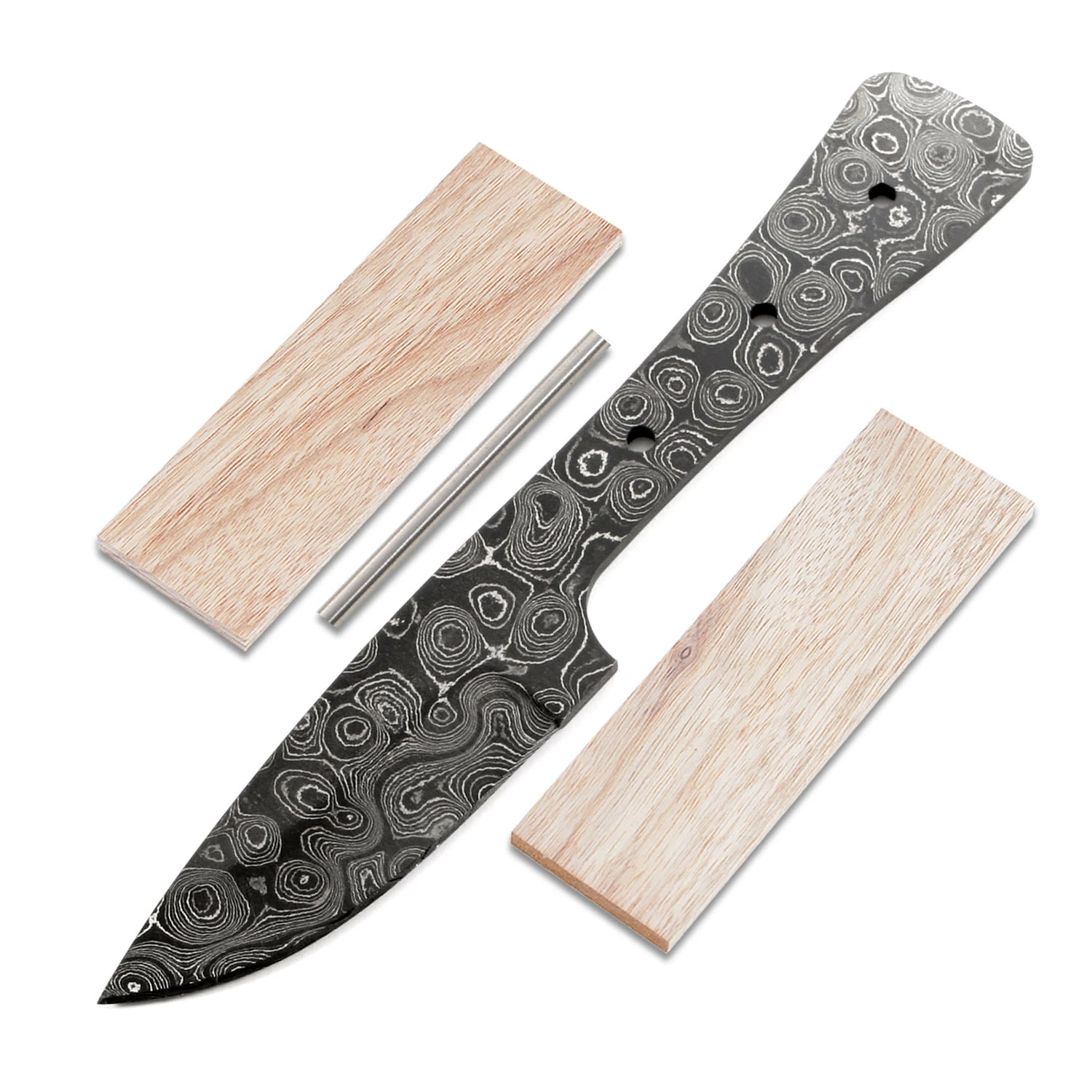 This damascus skinner blade blank design is called the “Virginia Skinner”. It is a USA Made carbon steel damascus fixed blade knife blank that is hollow-ground and ready to build. This model will make a fantastic personal skinning knife. It will also serve very well as a collectible gift project. The Virginia Skinner has a blade length of 2.75 inches and an overall length of 7.375 inches. Ground on both sides, the blade is 1.09 inches wide. This design features (3) 0.156 inches through-holes for handle construction (stainless steel pinstock included). The tang holes can be modified with ease to work with larger pinstock, or with threaded fasteners.