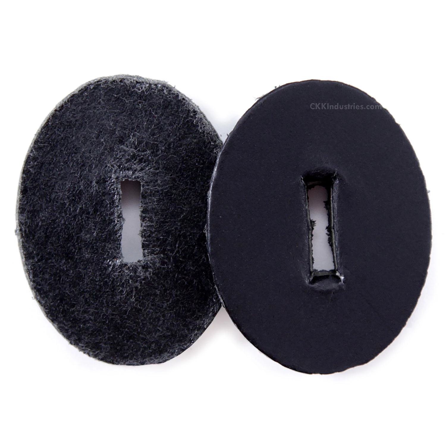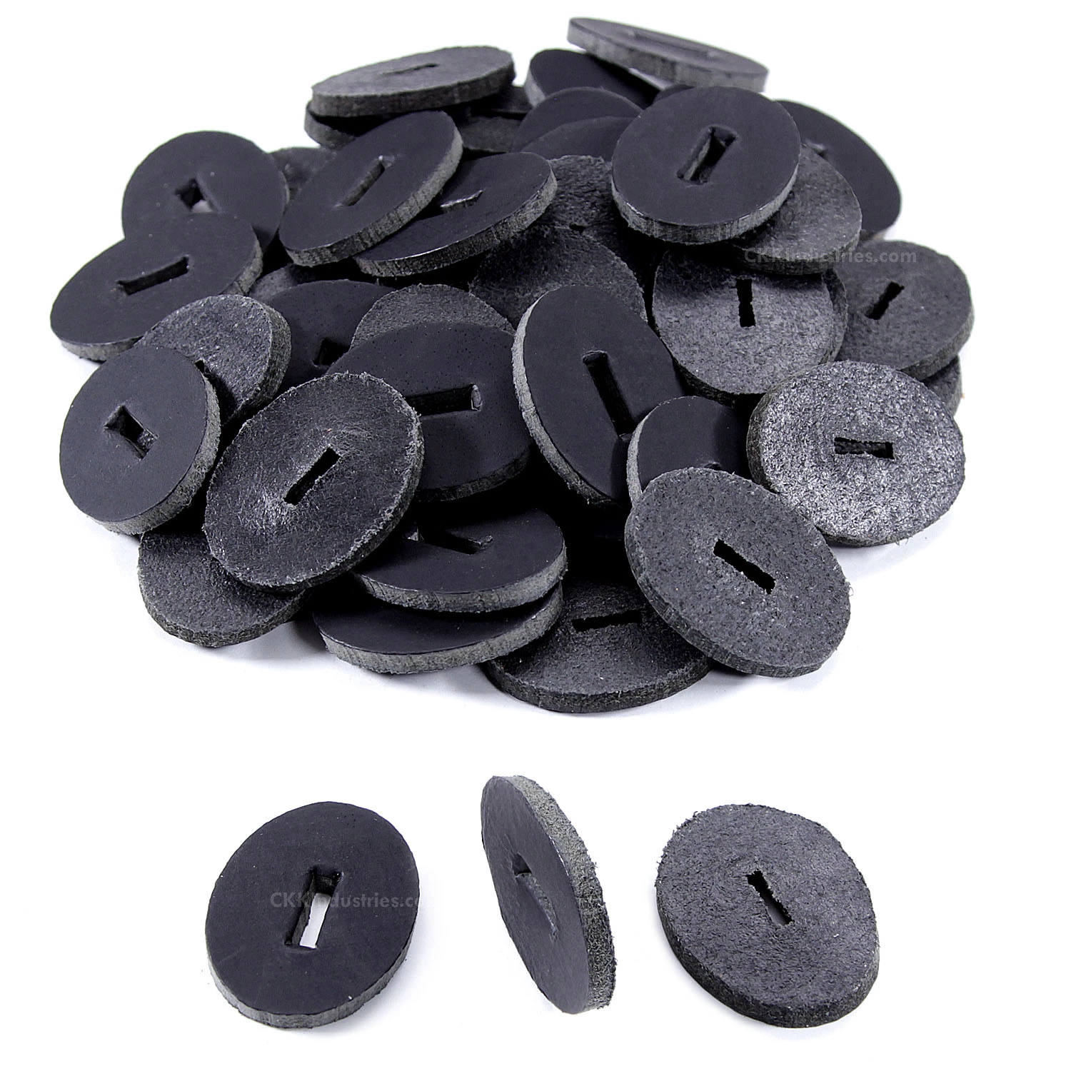 These are 1.30 x 1.00 x .125 inch leather handle washers. They are commonly used for creating custom handles on hidden tang knives. The inner opening is 0.40 x 0.120 inches and is designed for sliding over the tang of a knife. Once they are stacked, they can then be compressed into a uniform handle shape. After stacking and tightening, they can be sanded into the final handle configuration. These are high quality leather parts that are punched out of top-grain Water Buffalo leather in our USA facility. Once finished, they create excellent handles for knives and tools, and feature high-griping, durable surfaces. This style of handle treatment has been used throughout history and is still one of the best performing ever developed. They are noted for creating one of the most comfortable handle treatments available. This type of knife handle is also quite simple to construct, and will last a lifetime.