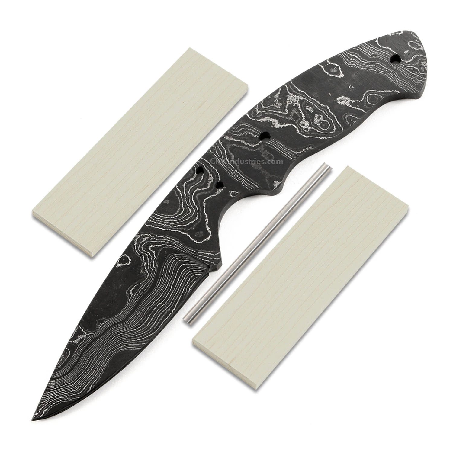 This damascus drop point knife making kit design is called “Whiplash”. It is a USA Made carbon steel damascus fixed blade knife blank that is hollow-ground and ready to build. This damascus blade blank model will make a fantastic personal carry knife. The Whiplash has a blade length of 2 inches and an overall length of 6.6875 inches. Ground on both sides, the blade is 1″ wide. This damascus drop point blade blank design features (2) 0.125 inch through-holes for handle construction (stainless steel handle pinstock included) with (2) 0.93 inch holes for user created bolsters (not included). The tang holes can be modified with ease to work with larger pinstock, or with threaded fasteners. Please see our drills and taps sections for more options. This version of the Whiplash is the combo kit. It comes with the Whiplash blade plus Curly Maple handle scales and stainless steel pinstock to simplify the completion process. This is a great project for a weekend knife making session. Spend some quality workshop time with this skinning knife kit and enjoy the fun of custom knife making and customization.