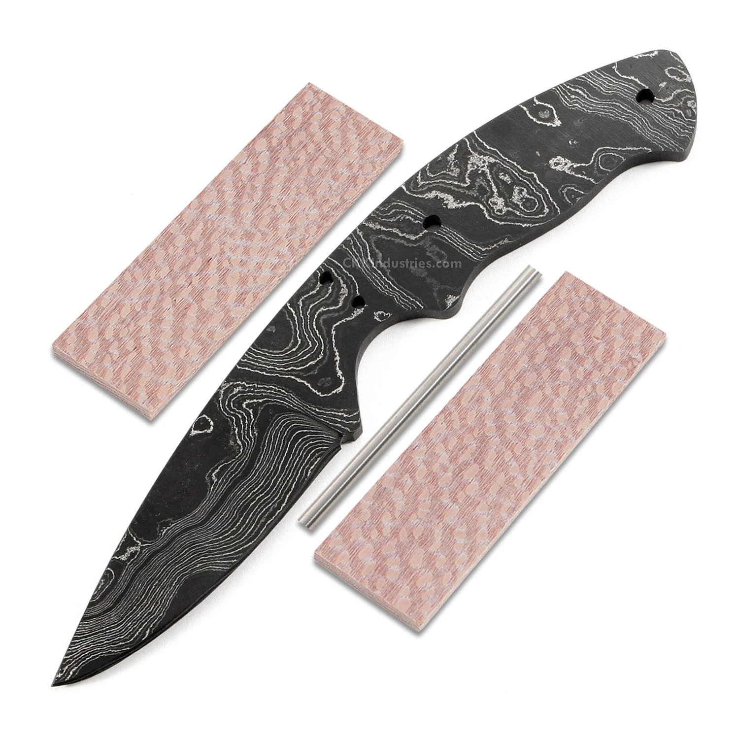 This damascus drop point knife making kit design is called “Whiplash”. It is a USA Made carbon steel damascus fixed blade knife blank that is hollow-ground and ready to build. This damascus blade blank model will make a fantastic personal carry knife. The Whiplash has a blade length of 2 inches and an overall length of 6.6875 inches. Ground on both sides, the blade is 1″ wide. This damascus drop point blade blank design features (2) 0.125 inch through-holes for handle construction (stainless steel handle pinstock included) with (2) 0.93 inch holes for user created bolsters (not included). The tang holes can be modified with ease to work with larger pinstock, or with threaded fasteners. Please see our drills and taps sections for more options. This version of the Whiplash is the combo kit. It comes with the Whiplash blade plus Lacewood handle scales and stainless steel pinstock to simplify the completion process. This is a great project for a weekend knife making session. Spend some quality workshop time with this skinning knife kit and enjoy the fun of custom knife making and customization.