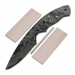 This damascus drop point knife making kit design is called “Whiplash”. It is a USA Made carbon steel damascus fixed blade knife blank that is hollow-ground and ready to build. This damascus blade blank model will make a fantastic personal carry knife. The Whiplash has a blade length of 2 inches and an overall length of 6.6875 inches. Ground on both sides, the blade is 1″ wide. This damascus drop point blade blank design features (2) 0.125 inch through-holes for handle construction (stainless steel handle pinstock included) with (2) 0.93 inch holes for user created bolsters (not included). The tang holes can be modified with ease to work with larger pinstock, or with threaded fasteners. Please see our drills and taps sections for more options. This version of the Whiplash is the combo kit. It comes with the Whiplash blade plus Mahogany handle scales and stainless steel pinstock to simplify the completion process. This is a great project for a weekend knife making session. Spend some quality workshop time with this skinning knife kit and enjoy the fun of custom knife making and customization.