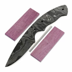 This damascus drop point knife making kit design is called “Whiplash”. It is a USA Made carbon steel damascus fixed blade knife blank that is hollow-ground and ready to build. This damascus blade blank model will make a fantastic personal carry knife. The Whiplash has a blade length of 2 inches and an overall length of 6.6875 inches. Ground on both sides, the blade is 1″ wide. This damascus drop point blade blank design features (2) 0.125 inch through-holes for handle construction (stainless steel handle pinstock included) with (2) 0.93 inch holes for user created bolsters (not included). The tang holes can be modified with ease to work with larger pinstock, or with threaded fasteners. Please see our drills and taps sections for more options. This version of the Whiplash is the combo kit. It comes with the Whiplash blade plus Purpleheart handle scales and stainless steel pinstock to simplify the completion process. This is a great project for a weekend knife making session. Spend some quality workshop time with this skinning knife kit and enjoy the fun of custom knife making and customization.