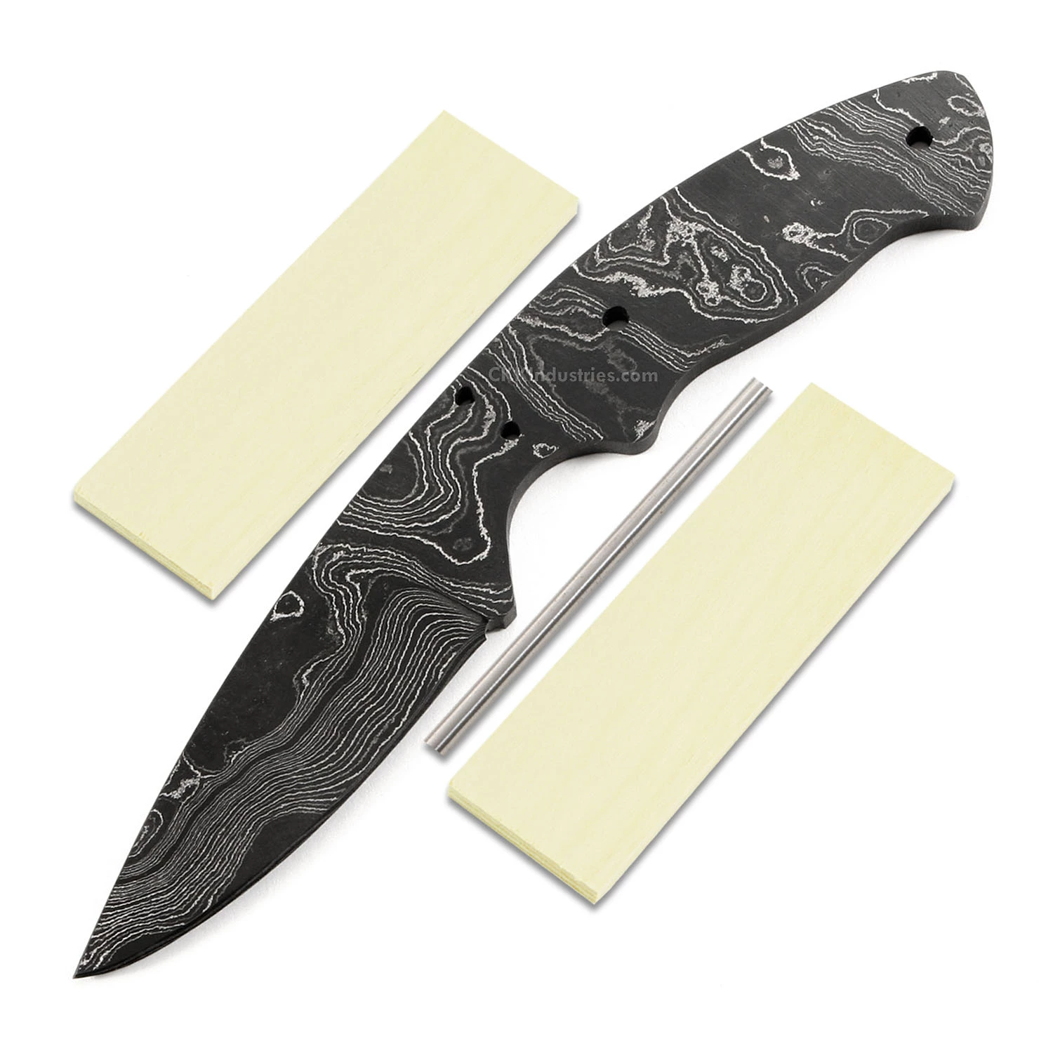 This damascus drop point knife making kit design is called “Whiplash”. It is a USA Made carbon steel damascus fixed blade knife blank that is hollow-ground and ready to build. This damascus blade blank model will make a fantastic personal carry knife. The Whiplash has a blade length of 2 inches and an overall length of 6.6875 inches. Ground on both sides, the blade is 1″ wide. This damascus drop point blade blank design features (2) 0.125 inch through-holes for handle construction (stainless steel handle pinstock included) with (2) 0.93 inch holes for user created bolsters (not included). The tang holes can be modified with ease to work with larger pinstock, or with threaded fasteners. Please see our drills and taps sections for more options. This version of the Whiplash is the combo kit. It comes with the Whiplash blade plus Yellowheart handle scales and stainless steel pinstock to simplify the completion process. This is a great project for a weekend knife making session. Spend some quality workshop time with this skinning knife kit and enjoy the fun of custom knife making and customization.