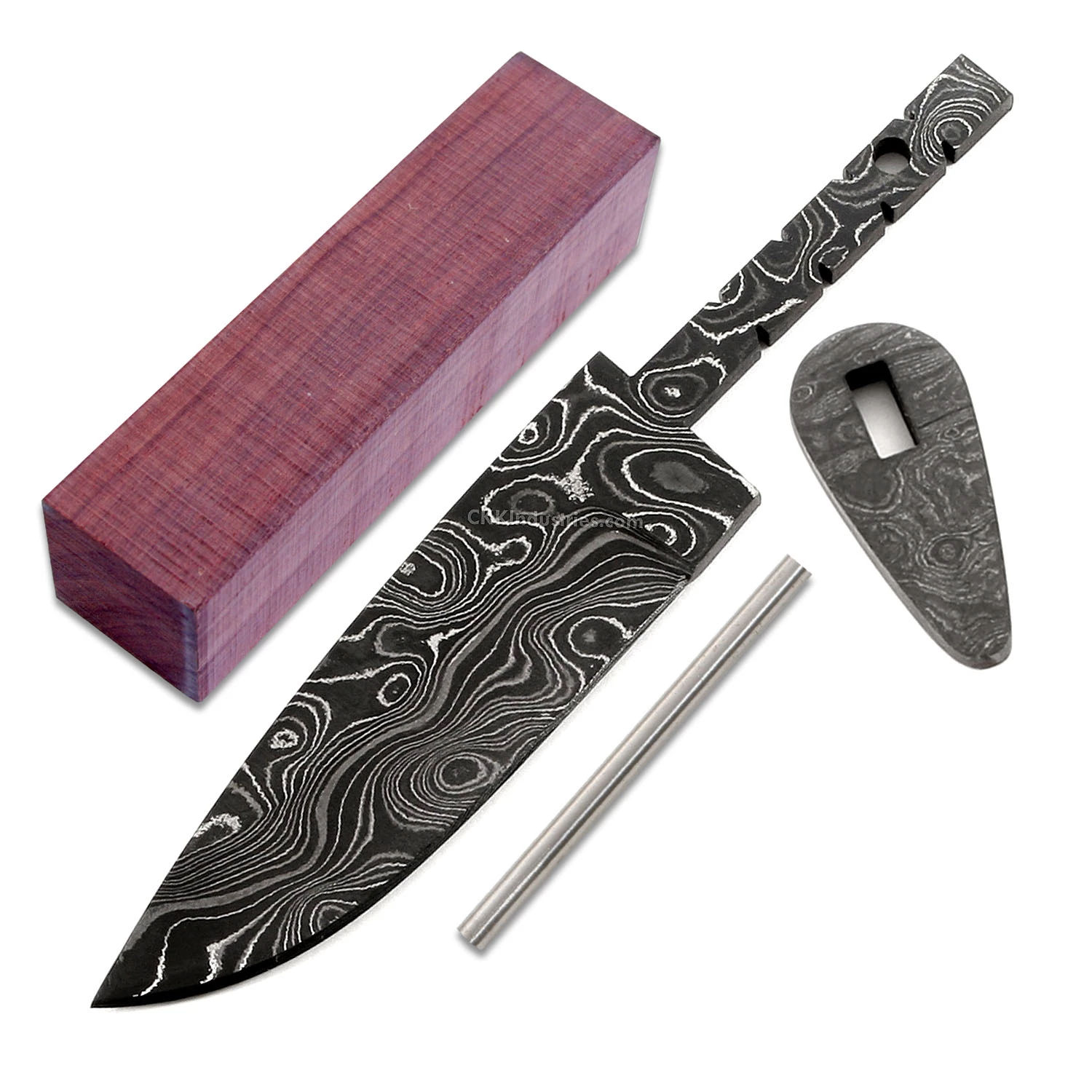 This damascus hidden tang knife making kit design is called the “Wolverine”. It is a USA Made carbon steel damascus fixed blade knife blank that is hollow-ground and ready to build. This damascus hidden tang blade blank model will make a great skinning knife project for the DIY builder. It is expertly designed and well made and comes with a matching damascus guard. With a blade length of 3.312 inches and an overall length of 5.312 inches, this design is a perfect for side carry. Hollow ground on both sides, the Wolverine’s blade is 0.93 inches wide. This design features (1) 0.156 inch through-hole for handle construction (stainless steel pinstock included). The tang width is 0.312 inches and can be modified with ease to work with small pinstock, or with a threaded end fastener.