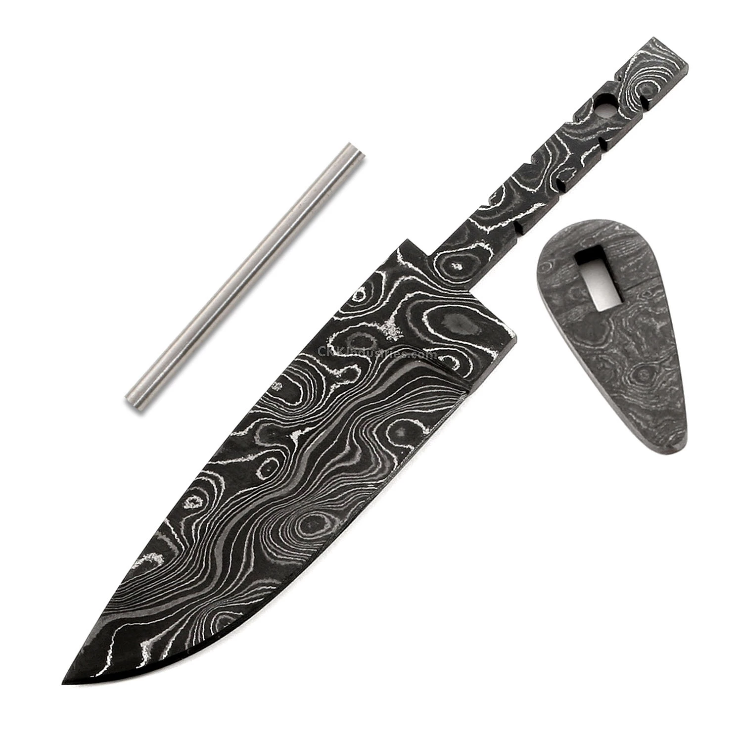 This damascus hidden tang knife making kit design is called the “Wolverine”. It is a USA Made carbon steel damascus fixed blade knife blank that is hollow-ground and ready to build. This damascus hidden tang blade blank model will make a great skinning knife project for the DIY builder. It is expertly designed and well made and comes with a matching damascus guard. With a blade length of 3.312 inches and an overall length of 5.312 inches, this design is a perfect for side carry. Hollow ground on both sides, the Wolverine’s blade is 0.93 inches wide. This design features (1) 0.156 inch through-hole for handle construction (stainless steel pinstock included). The tang width is 0.312 inches and can be modified with ease to work with small pinstock, or with a threaded end fastener.